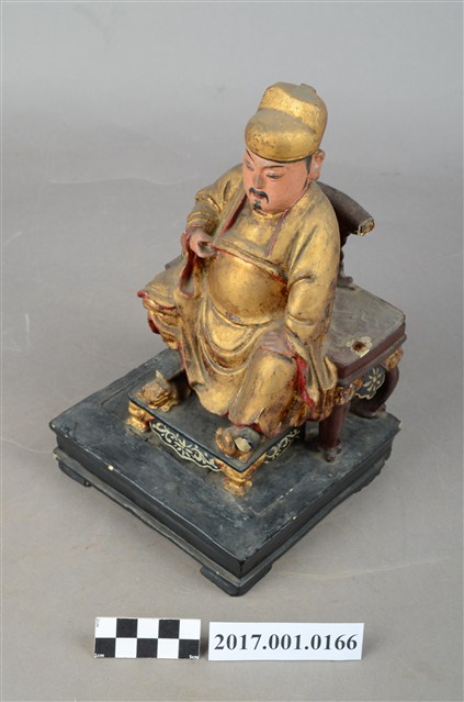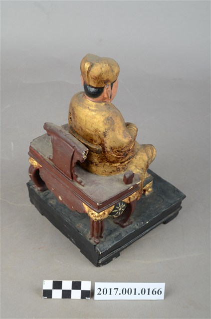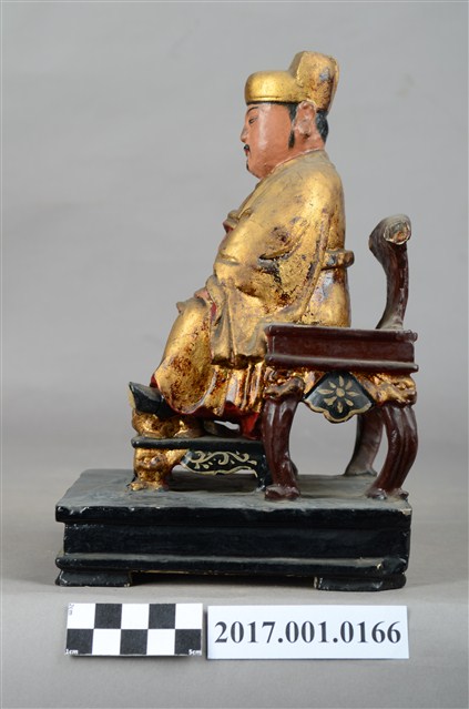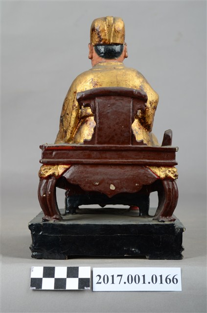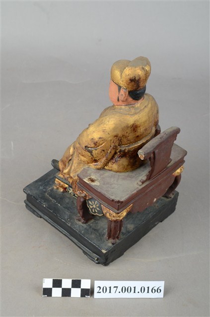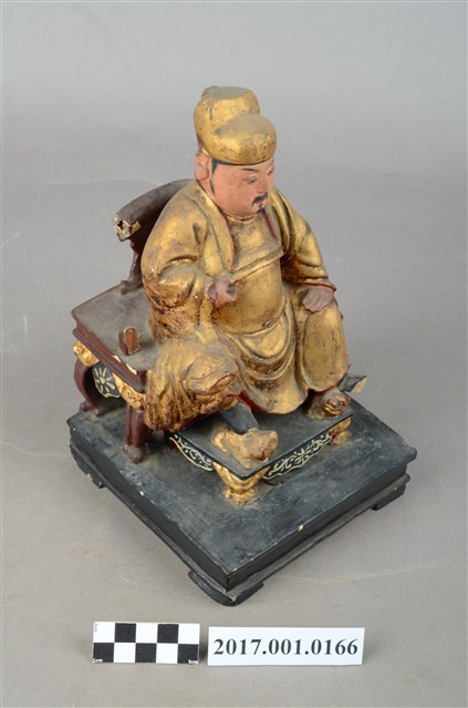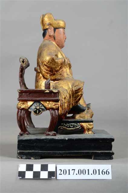 1.本件木雕王爺像採坐姿,端坐於圈背椅上,冠服以安金為主,臉部施粉紅色漆,鬍鬚脫落,粧佛保存良好,座椅兩側扶手缺損。王爺像作中年男子相貌,嘴部上下方分別繪有短鬚。頭戴幞頭,身著圓領袍服,外披開襟罩衫,腹部束有腰帶。左手扶於左膝之上,右手小臂上舉握胸前之看帶,雙足踏於座前踏几獅子背上,對獅之頭部朝前,左腿略為前伸,鞋尖翹起,右足略為後伸,座下之臺座作束腰方臺。