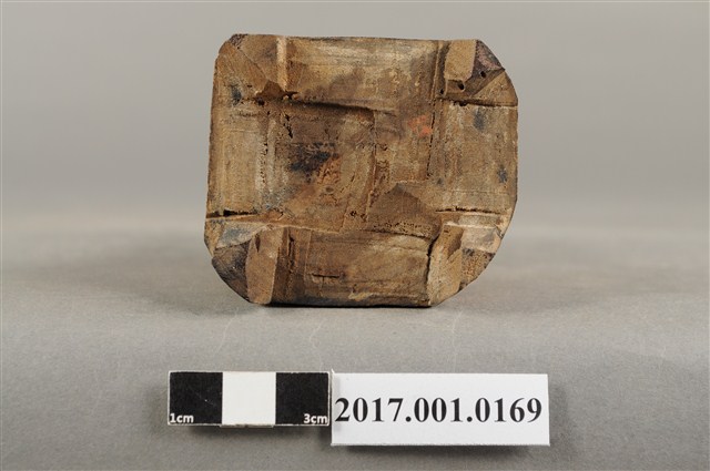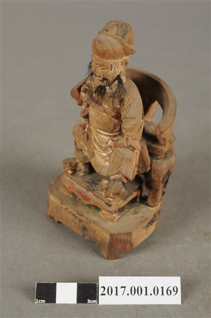 1.本件木雕王爺像採坐姿,端坐於圈背椅上,表面粧佛已除去,座椅兩側扶手缺損。王爺像作中年男子相貌,上額兩道抬頭紋,嘴部上下及兩腮處植有鬍鬚,頭戴幞頭,身著圓領袍服,腹部束有腰帶。左手扶於左膝之上,右手小臂平舉握胸前看帶,雙足踏於座前踏几上的獸座,左腿略為前伸,鞋尖上翹,臺座作有腳方臺。