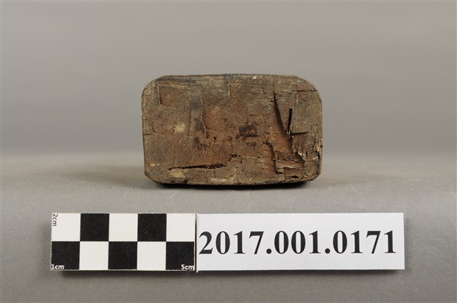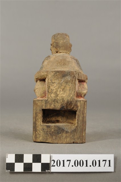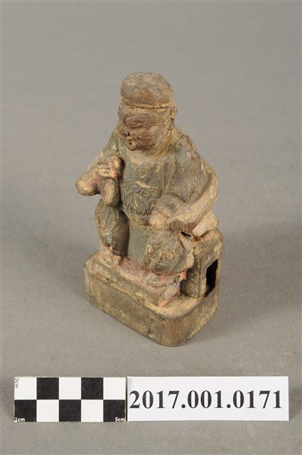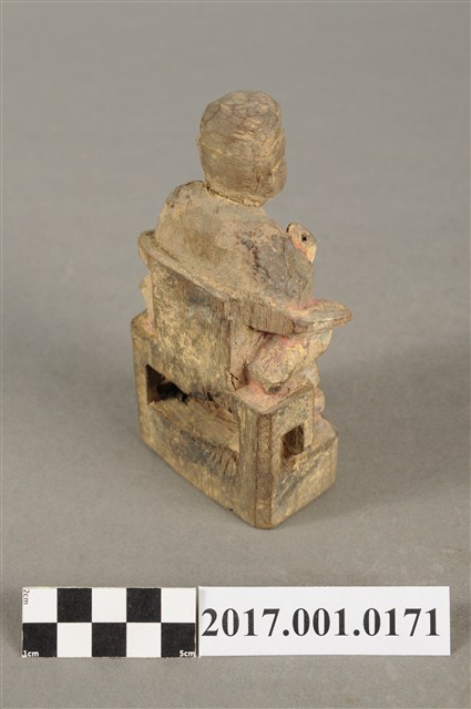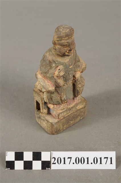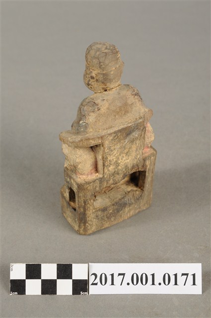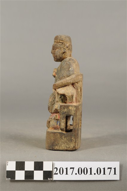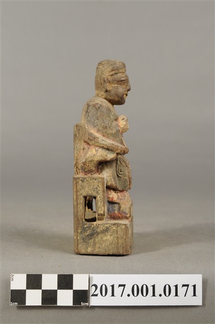 1.本件木雕王爺像尺寸微小,採坐姿,端坐於圈背椅上,雕工、粧佛簡潔,表面佈滿污漬,帽冠缺失,後頸部一道橫裂紋。王爺像作中年男子相貌,無鬚,下頷圓潤,嘴角上揚,眼嘴帶笑意。頭戴圓巾,可另外加戴帽冠,身著圓領袍服,腹部束有腰帶,袍服之腹部、雙膝部位有粉線盤飾紋樣。右手小臂向前上舉,手指虛握,手中持物已失,左手握腰帶左側,雙足踏於座前踏几上,臺座作矮方臺。