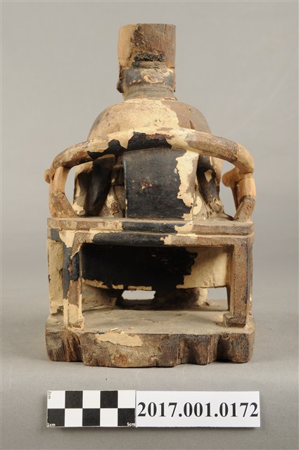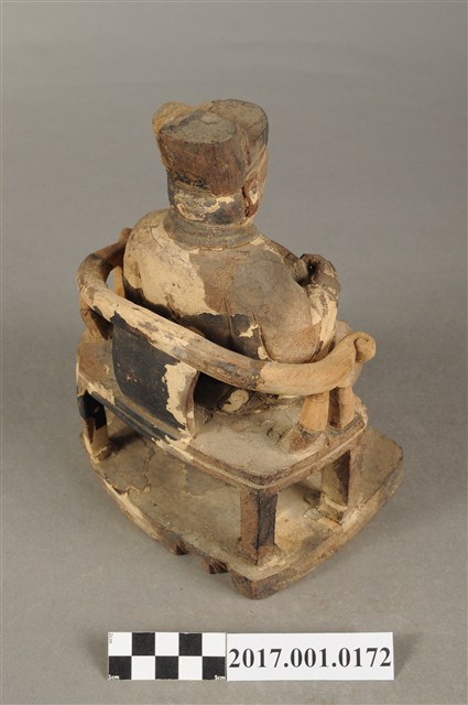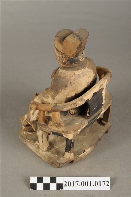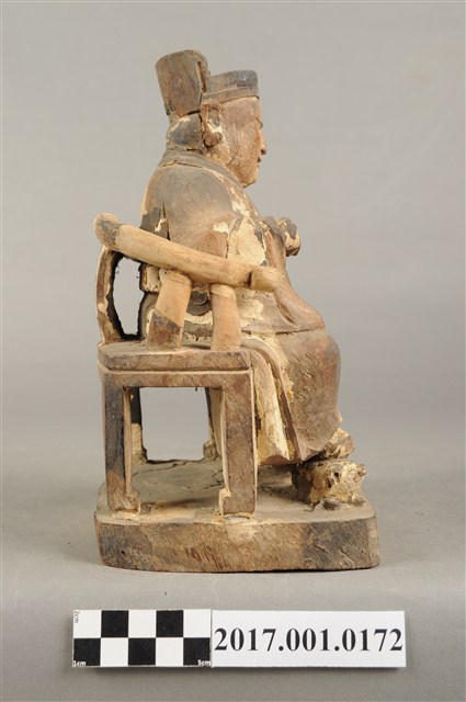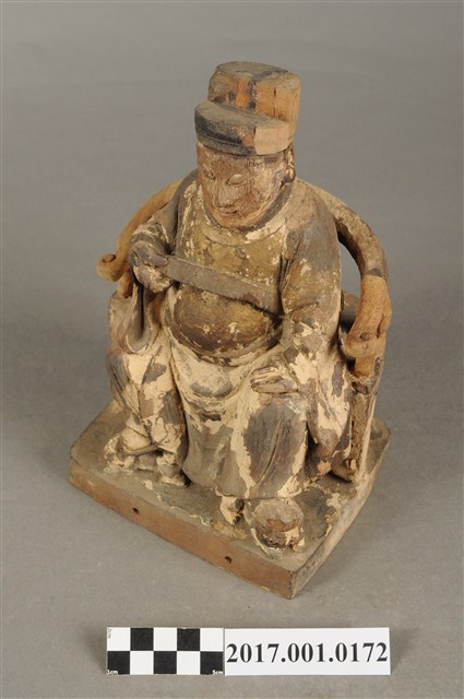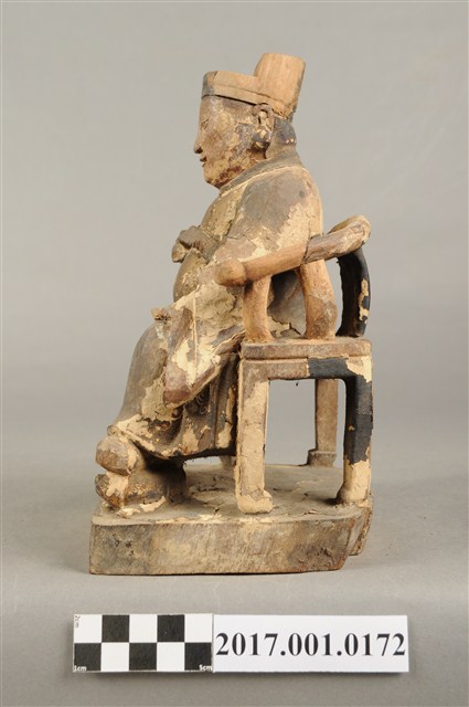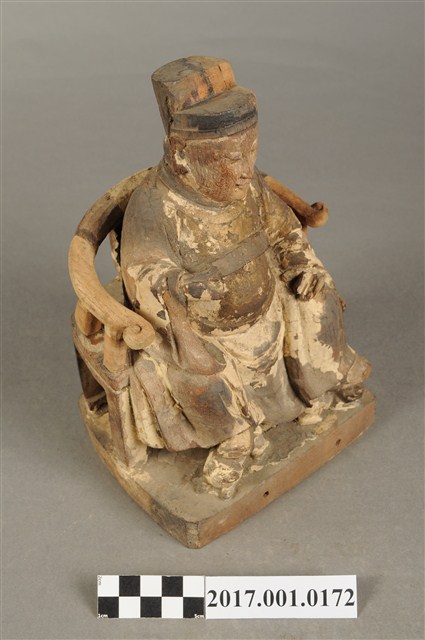 1.本件木雕王爺像採坐姿,端坐於圈背椅上,表面粧佛大面積褪去,臺座前端兩個小孔,後端局部缺損。王爺像作年輕男子相貌,無鬚,五官娟秀,嘴角上揚帶有笑意,頭戴幞頭,身著圓領袍服,腹部束有腰帶。左手扶於左膝之上,右手小臂向前平舉握胸前之看帶,雙足踏於座前踏几上的獸座,臺座作矮方臺。