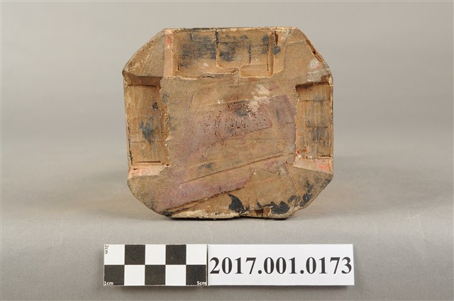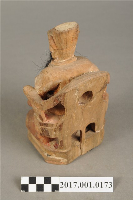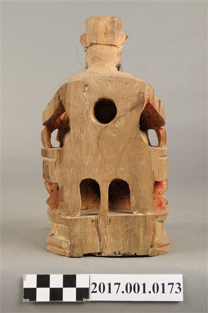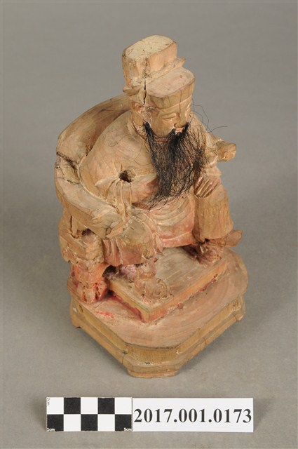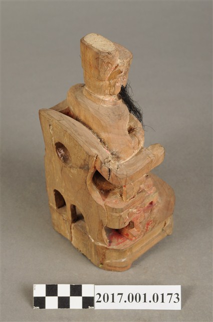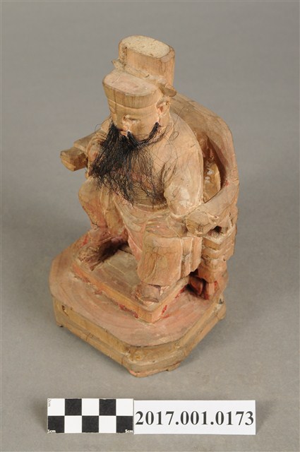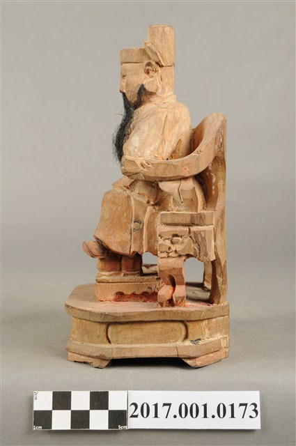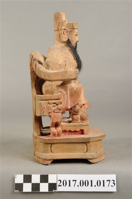 1.本件木雕王爺像採坐姿,端坐於圈背椅上,表面粧佛大面積除去,下半部殘留朱紅色,背後開有圓形入神洞,封榫佚失,內部物件已取出。王爺像作中年男子相貌,嘴部兩側上方、下頷及兩腮處植有五柳鬚,頭戴幞頭,身著圓領袍服,腹部束有腰帶。左手手指朝內支撐於左膝之上,右手小臂向內平舉握胸前看帶,雙足踏於臺座前踏几上的獅子背上,臺座作束腰方臺。