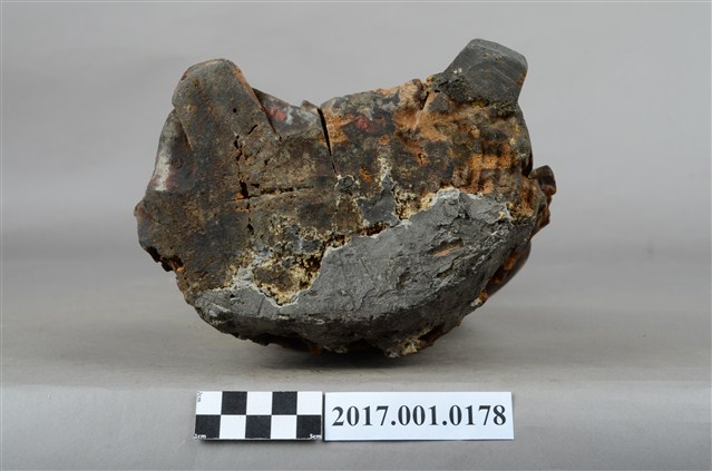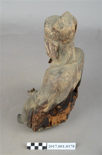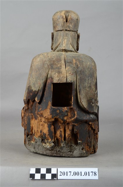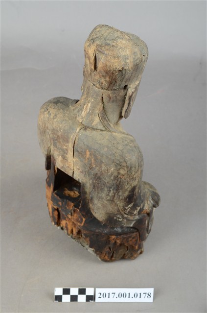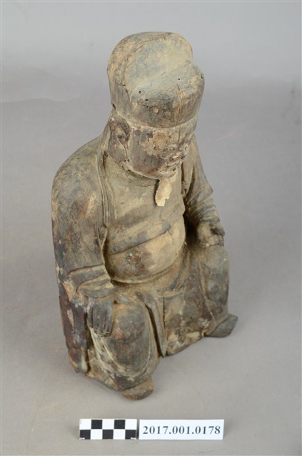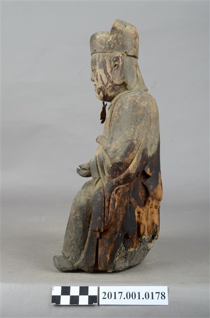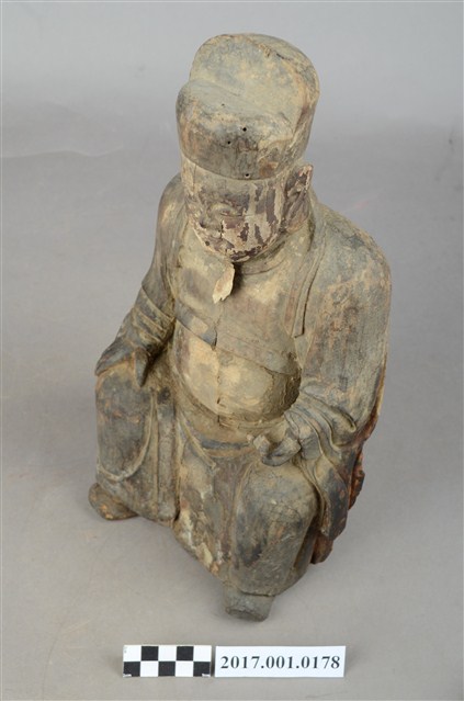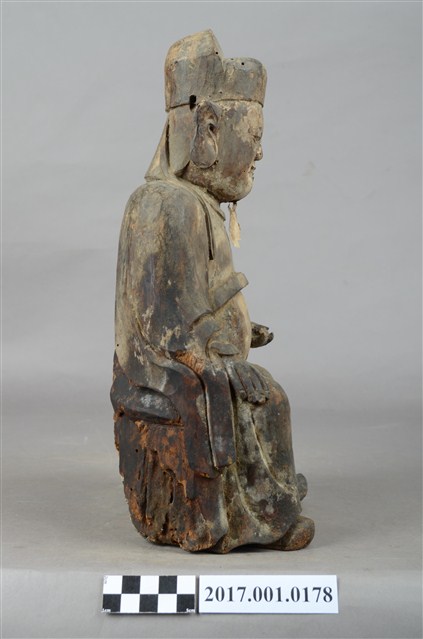 1.本件木雕王爺像採坐姿,端坐於圓形臺座上,表面粧佛大面積褪去,鬍鬚脫落,背後開有正方形入神洞,封榫佚失,內部物件已取出。王爺像作中年男子相貌,嘴唇兩側上方、下頷鑽有孔作為植鬚處,頭戴圓巾,後端鑿有一道尖端朝下的銳三角形榫槽,以作為安裝帽冠之用,身著圓領袍服,腹部束有腰帶。左手小臂向前伸出,手掌朝上手指彎曲作持物狀,右手扶於右膝之上,雙足踏於地面。