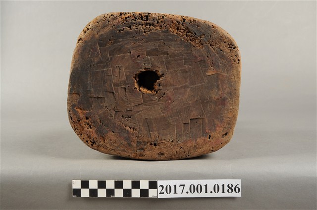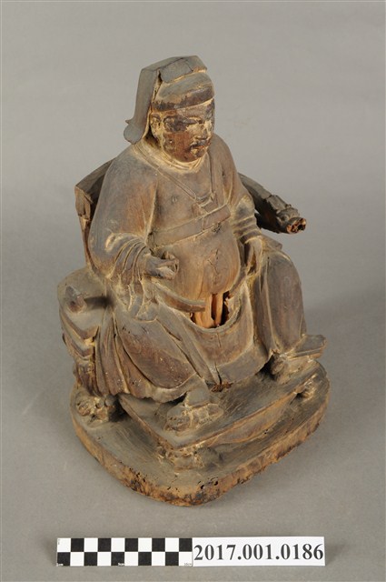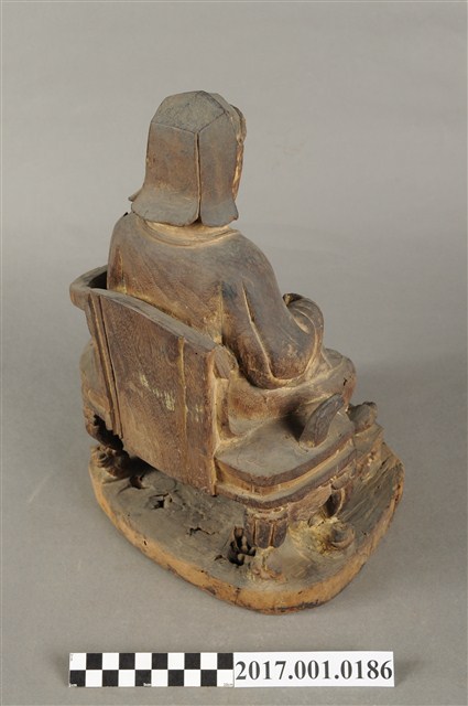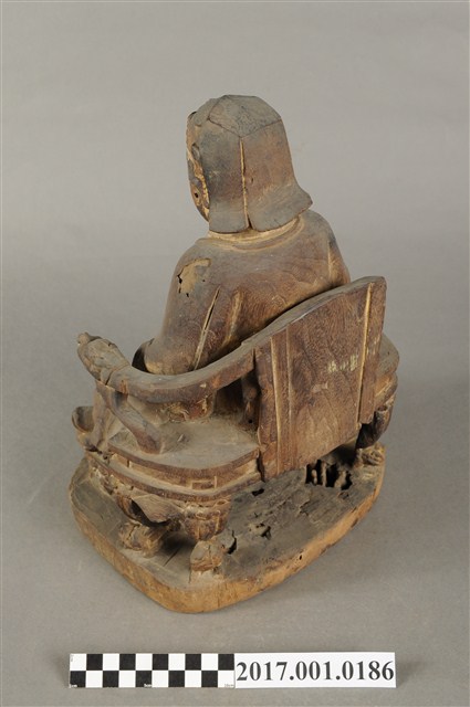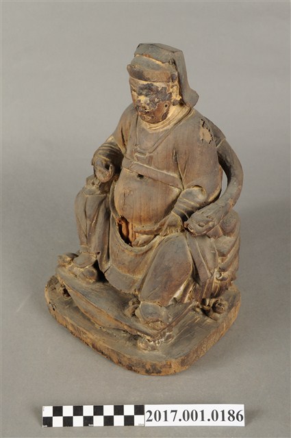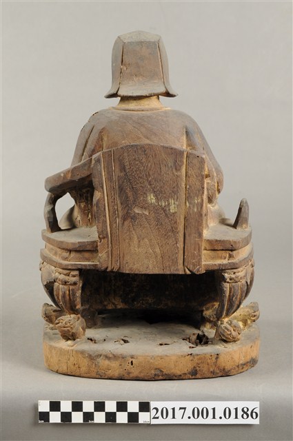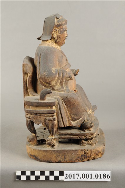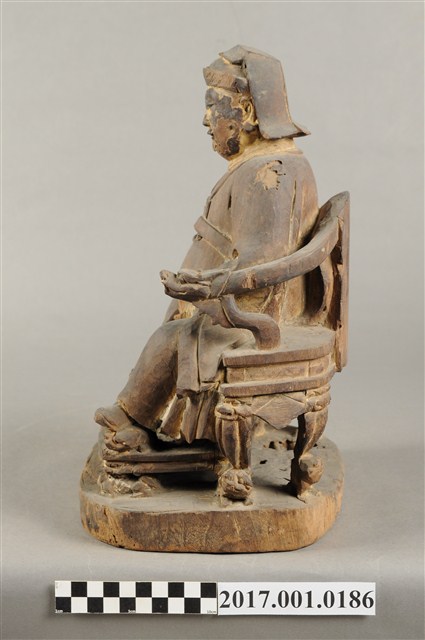 1.本件木雕王爺像採坐姿,端坐於圈背椅上,表面粧佛已除去,鬍鬚脫落,腹部看帶下方一小破洞,腰帶中央破損,座椅右側扶手斷裂缺損。王爺像作中年男子相貌,神情祥和,鼻下兩側及嘴部下方鑽有孔作為植鬚處,頭戴圓巾,巾之兩側及後端垂有翼片,類似貂嬋冠,身著圓領袍服,腹部上下束有看帶及腰帶,頸下掛一只鎖形物。左手下垂握腰帶,右手小臂前舉,手掌朝上手指虛握,持物已失,雙足踏於蹲伏在踏几的獅子背上,圈背椅扶手出頭作龍頭,臺座作圓臺,臺座四周磨損。
