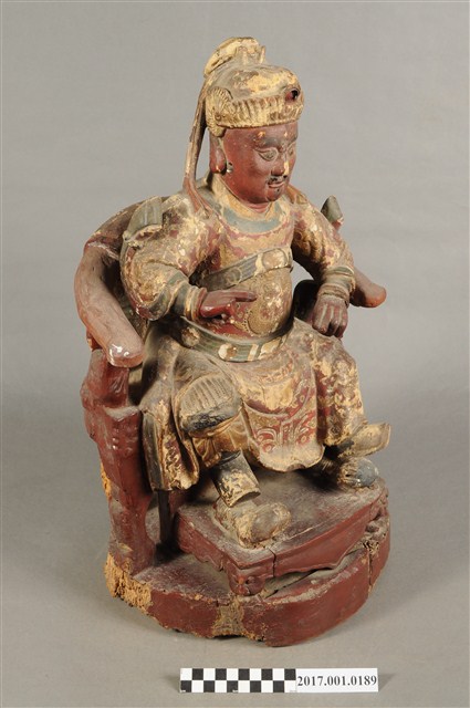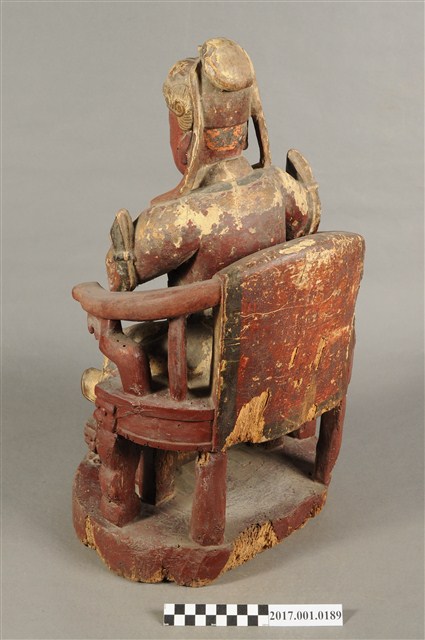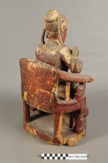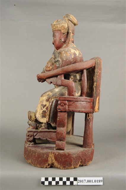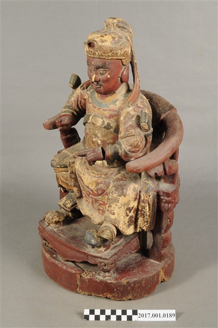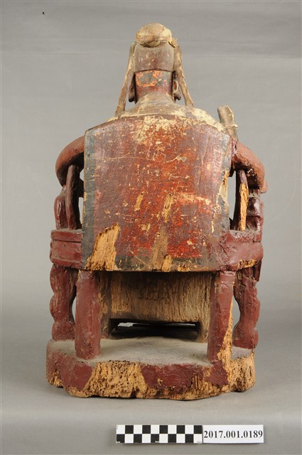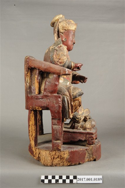 1.本件木雕王爺像採坐姿,端坐於圈背椅上,表面施以漆線安金技法粧佛。王爺作中年男子相貌,臉色絳紅,長耳,濃眉大眼,鼻頭顴骨凸出,嘴部有植鬚孔。頭戴兜鏊,身著甲袍,袍服漆線盤飾蟒、花卉、雲朵等紋飾,胸前有看帶,腰繫玉帶,腳穿皂靴踩獸座。左手作劍指,手掌朝下置於胸前,右手作劍指微指向左上,左腳向左前方伸出,右腳內縮,作文武腳姿態。圈背椅前置踏几,几腳飾吞口紋,臺座作圓矮臺。