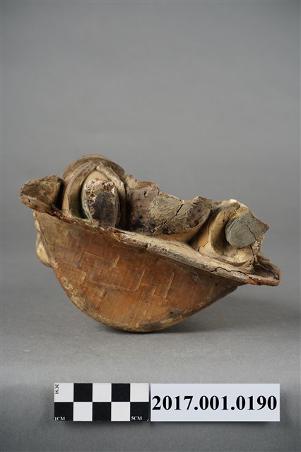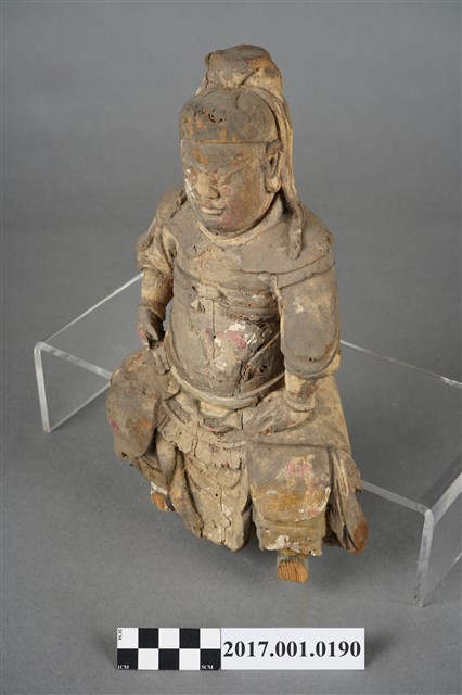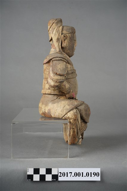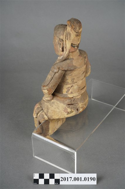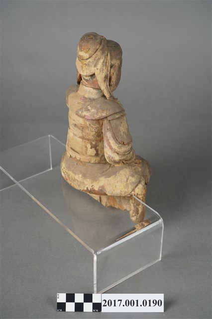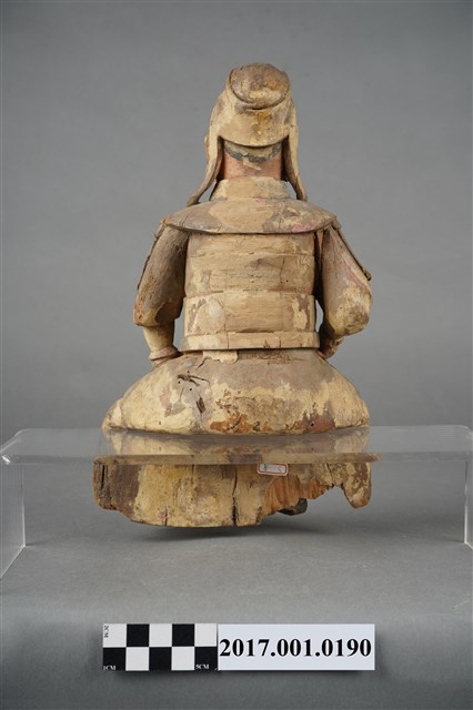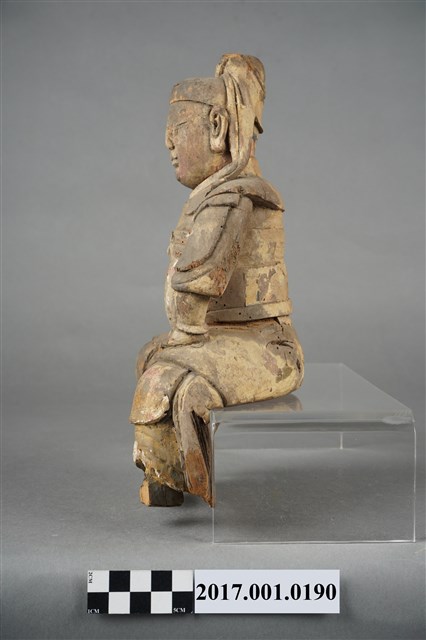 1.本件木雕王爺像採坐姿,為脫椅技法,粧佛已除去。王爺做年輕男子相貌,無鬚,臉頰豐腴,雙目半睜,鼻頭凸出。頭戴軟巾,身著甲袍,腰部束腰帶,胸前有看帶。左手置於左膝上,右手扶持腰帶。左腳向外伸出,足跟支地,右腳內縮,作文武腳姿態,雙足尖端皆削去。神像背後底部貼有以黑色原子筆書寫「85」之標籤。