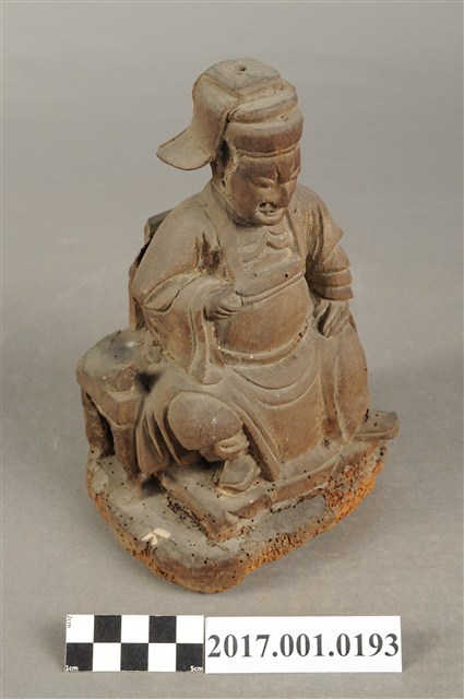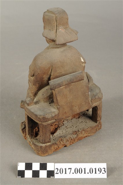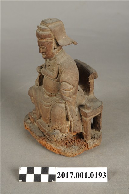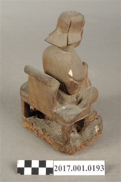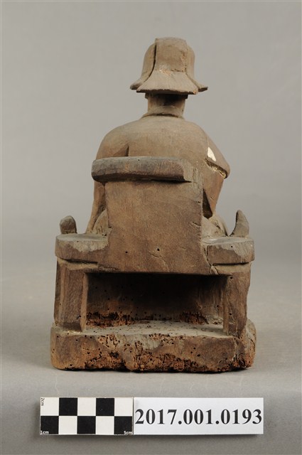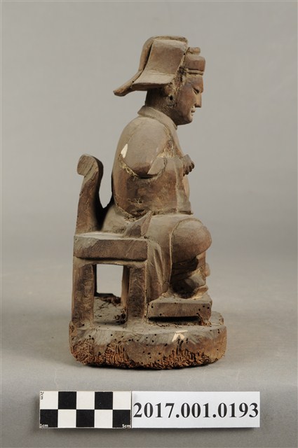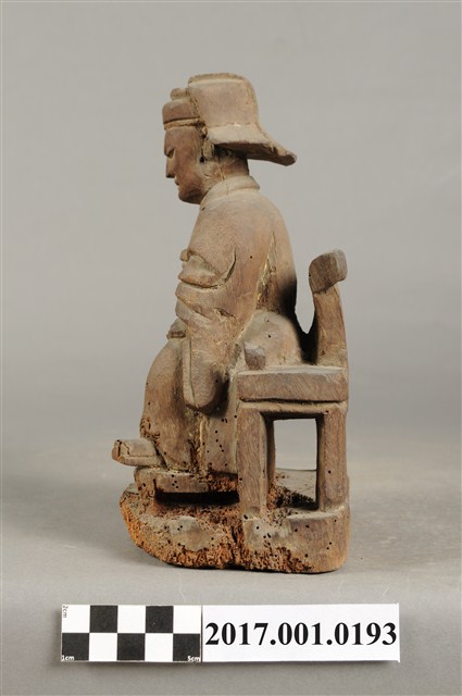 1.本件木雕王爺像採坐姿,端坐於圈背椅上,粧佛已除去。王爺作中年男子相貌,嘴部有植鬚孔,皺眉,雙目半睜,臉頰清瘦。頭戴國公帽,身著寬袖長袍,腰部束腰帶,胸前有看帶,腳穿皂靴。左手扶左膝,右手抬持看帶。左腳向左前方伸出,右腳內縮,作文武腳姿態,圈背椅前置踏几,臺座作方圓矮台。圈背椅兩側扶手削落。神像底部多有蟲蛀孔。