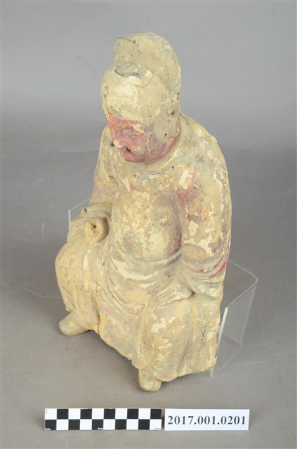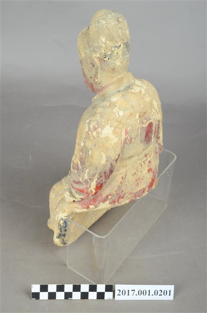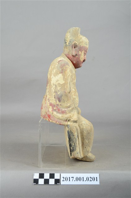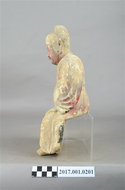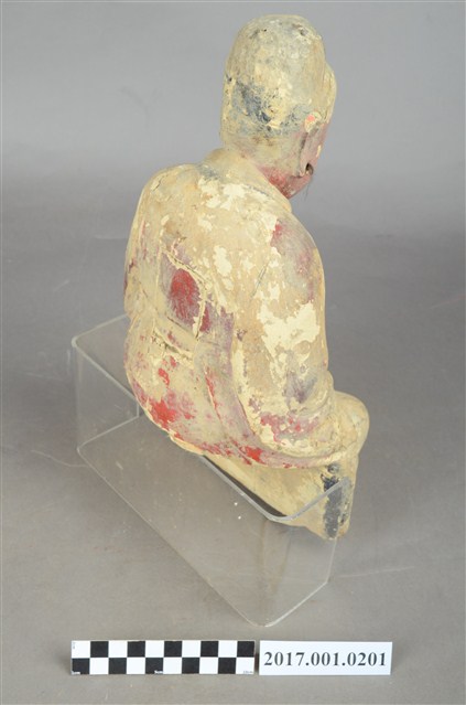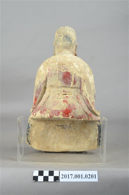 1.本件木雕王爺像採坐姿,座椅已失,表面粧佛已褪去,臉部存留大面積朱紅色,鬍鬚脫落,背後開有上寬下窄之梯形入神洞,封榫尚存。王爺像作中年男子相貌,臉型圓潤,鼻下兩側及嘴下個鑽一小洞,作為植鬚處,鼻下及右腮處殘留少量鬍鬚,頭戴幞頭,身著圓領袍服,腹部束腰帶。左手扶於左膝之上,右手握拳置於右大腿之上,手中持物已失,雙足平踏於地面。
