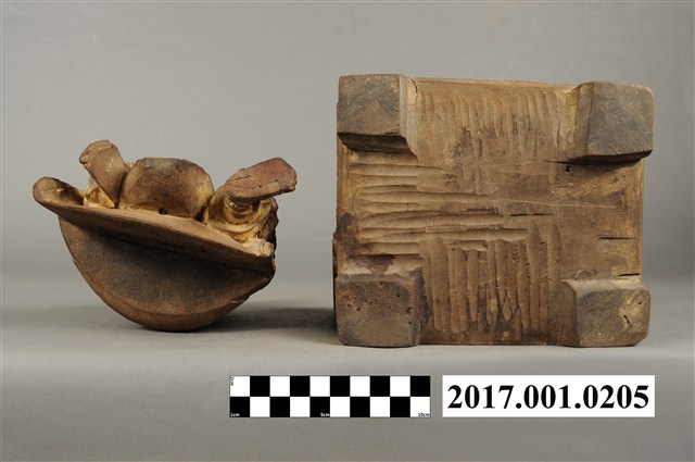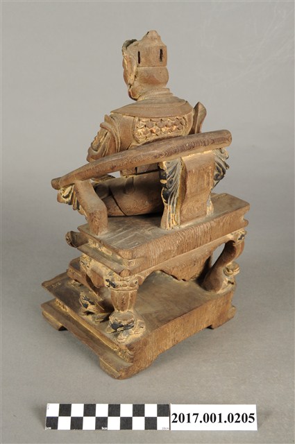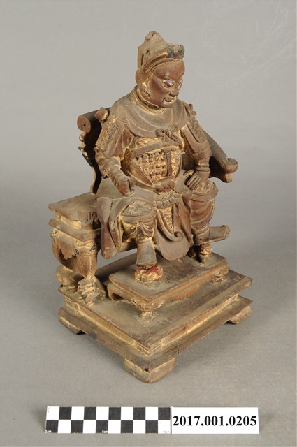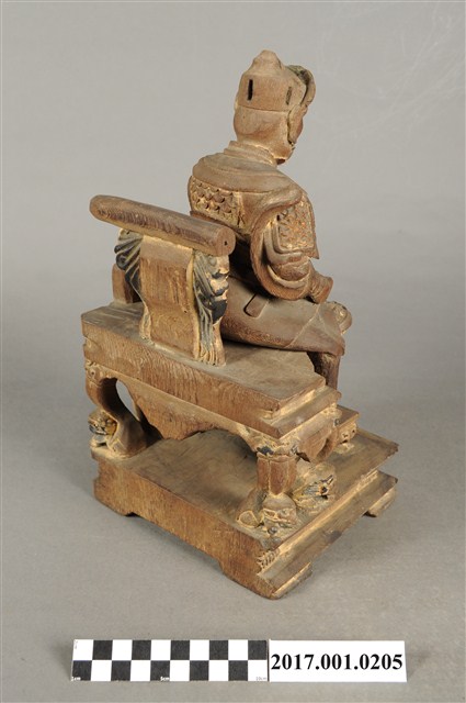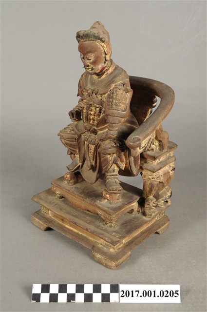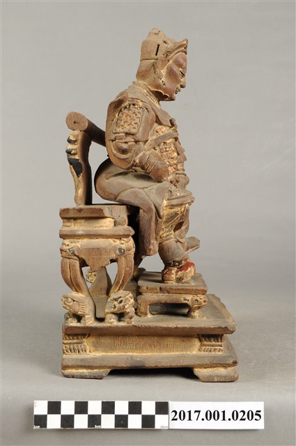 1.本件木雕王爺像採坐姿,端坐於圈背椅上,表面施以錦雕安金技法粧佛,安金層已除去。王爺作中年男子相貌,嘴部有植鬚孔,高額長耳,雙目半睜。頭戴兜鏊,身著甲袍、甲裙,袍服雕飾鎧甲鱗片分明,腳穿皂靴踩獸座。左手手掌扶於左膝,右手握拳置於右膝上,左腳向左前方伸出,右腳內縮,以腳尖支地,作文武腳姿態。圈背椅右側扶手出頭削去,圈背椅前置踏几雕飾獸座,臺座作束腰方高臺。