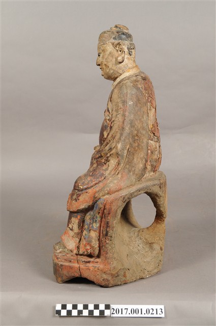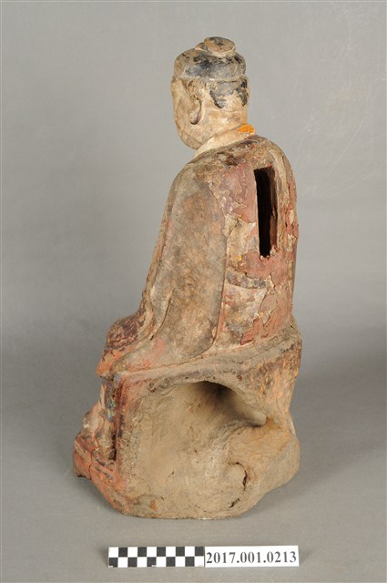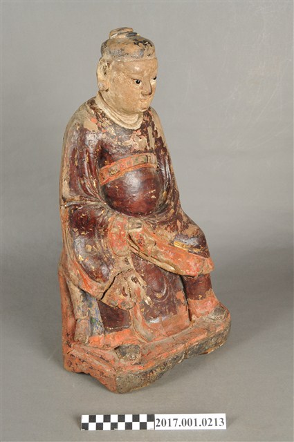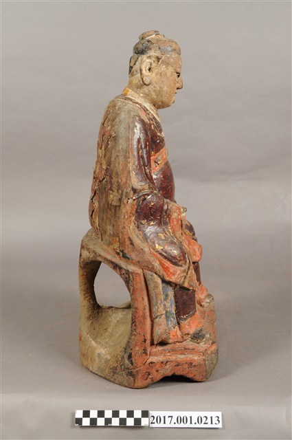 1.本件木雕王爺像採坐姿,端坐於臺座上,表面粧佛斑駁脫落,臉部顏色褪盡,臺座前方一道縱裂紋,背後開有一道長方形入神洞,內部物件已取出。王爺像作年輕男子相貌,無鬚,以黑色玻璃填入眼球,雙眼炯炯有神,頭頂束髮髻,頭圍略為收縮,形成一道收線,以利外加帽冠,帽冠已失。身著圓領袍服,腰部束腰帶,胸前束看帶。雙手下垂,左手右伸,手掌隱於袖內,以右手握左袖尾端,僅露出右手拇指,是為抱袖(壽)體。雙足踏於座前,臺座作方形矮臺,底部前方兩側與左後方佈有蛀蝕細孔。
