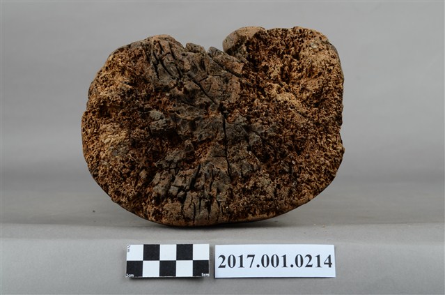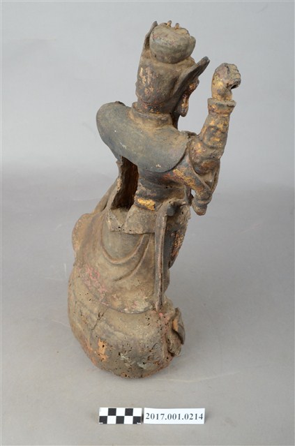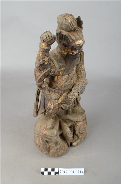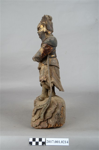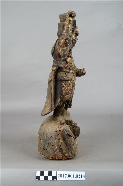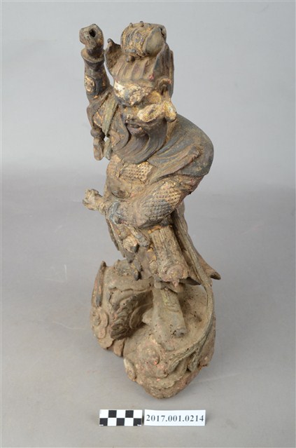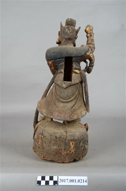 1.本件木雕王靈官像採立姿,站於圓臺上,通身佈滿污漬,表面殘留安金裝飾,上額及雙頰剝落,第三隻眼缺損,背後開有長方形入神洞,內部物件已取出。王靈官像作三眼武將造形,頭部微轉向左方,方臉大耳,嘴部雕有鬍鬚垂至胸前。頭戴小冠,雙鬢朝天,身著窄袖長袍,外罩鎧甲,腳穿戰靴,雙肩掛飄帶,下端自兩脅前垂至臺座臺面,右方飄帶下端斷裂缺損。左手橫伸於胸前,結靈官指,右手上舉,握拳作持鞭狀,鐵鞭已失,左腳向左前方伸出,作三七步姿態,腳下臺座作雲紋雕飾,前方正中嵌一只火輪。