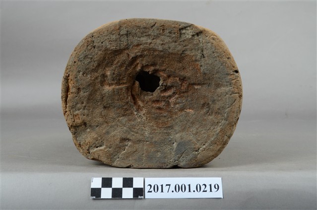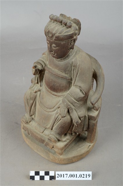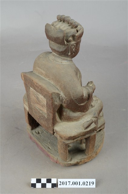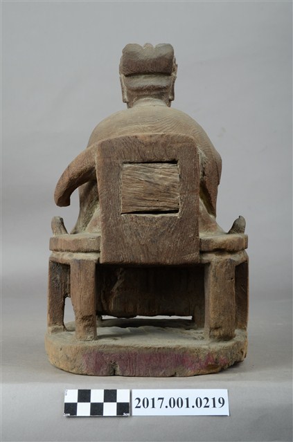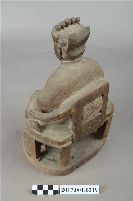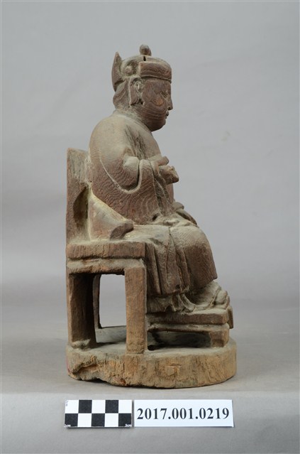 1.本件木雕水仙尊王像採坐姿,端坐於圈背椅上,表面粧佛已除去,鬍鬚脫落,座椅扶手斷裂,椅背後開有方形入神洞,封榫尚存。尊王作中年男子相貌,五官娟秀,嘴部上方兩側、下方有植鬚孔。頭戴通天冠,身著圓領袍服,腹束腰帶,胸前有看帶。左手扶於左膝之上,右手小臂前舉,手掌作握物狀,手中握物蛀蝕無法辨識。雙足著朝鞋,平踩於座前方形踏几上,臺座作矮圓臺。