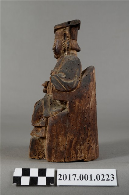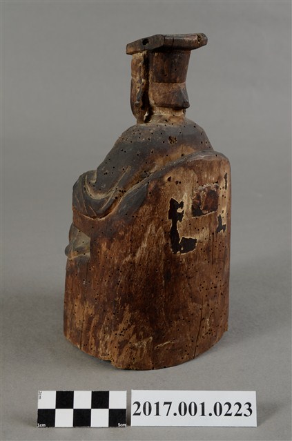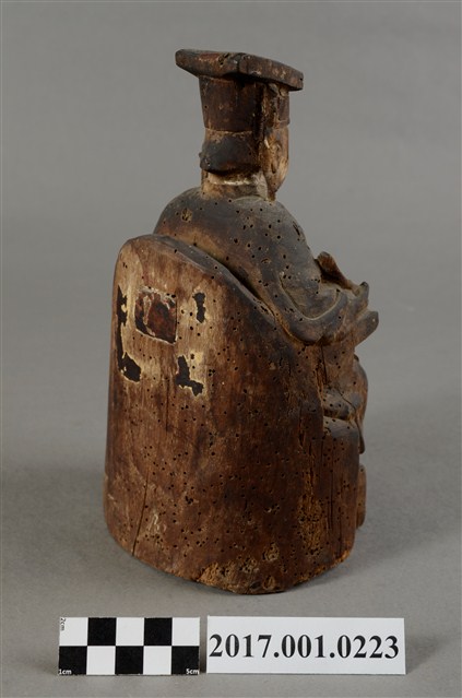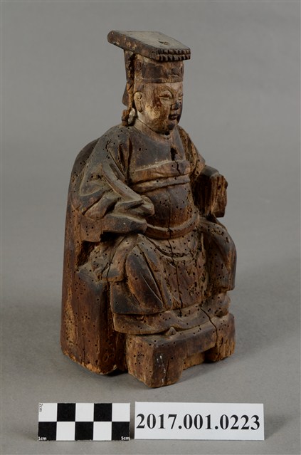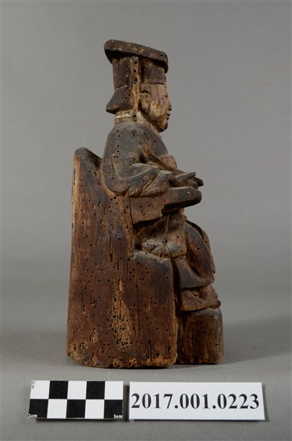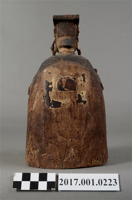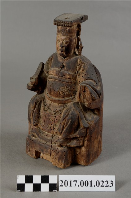 1.本件天上聖母像為木雕製成,表面粧佛已除去,神像佈滿蛀蝕小孔,神像背後開有方形入神洞,封榫尚存。媽祖雙目微睜,神情慈祥,頭戴冕冠,耳旁飾有鳳翅。媽祖身穿長袍未披飄帶,雙肘平靠於座椅扶手,右手持笏板,左手掌削落,手勢採平放式姿態,端坐圈背椅,雙足踏於踏几上。