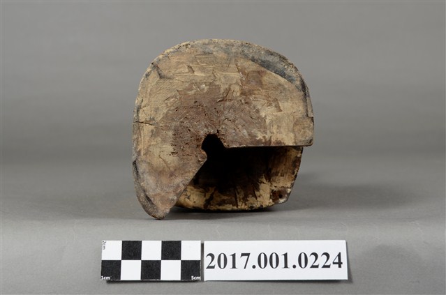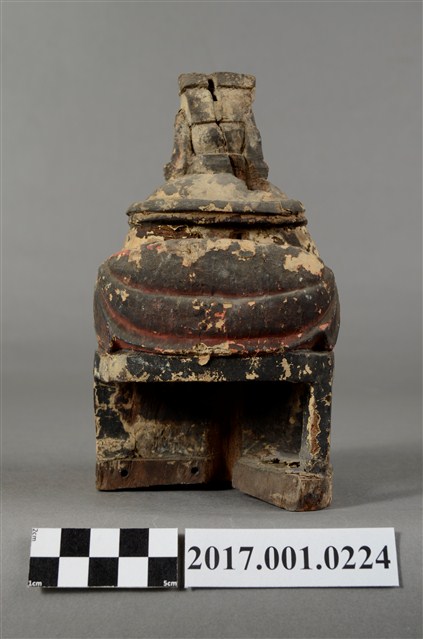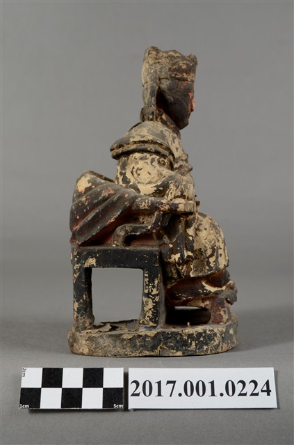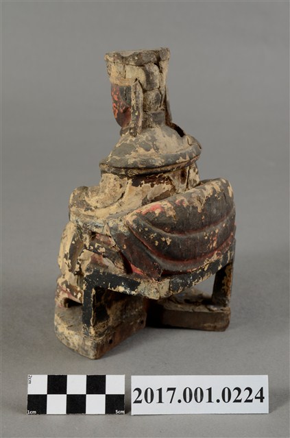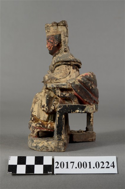 1.本件天上聖母像為木雕製成,表面以粉雕粧佛,粧佛大部分已除去。媽祖雙眼垂視,臉色赭紅,臉上薰黑層剝落,致五官模糊,頭戴冕冠,耳旁飾有鳳翅。身著盤領長袍,雙手上臂披飄帶,雙肘平靠於扶手,雙手手掌削落。手勢採平放式姿態,端坐圈背椅,雙足踏於踏几上。神像左後方臺座半部脫落。