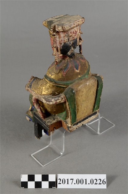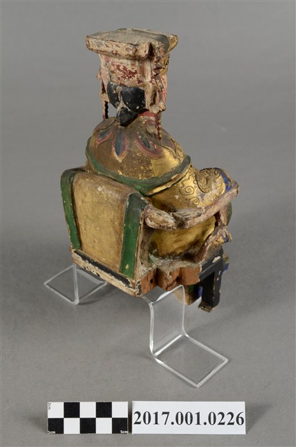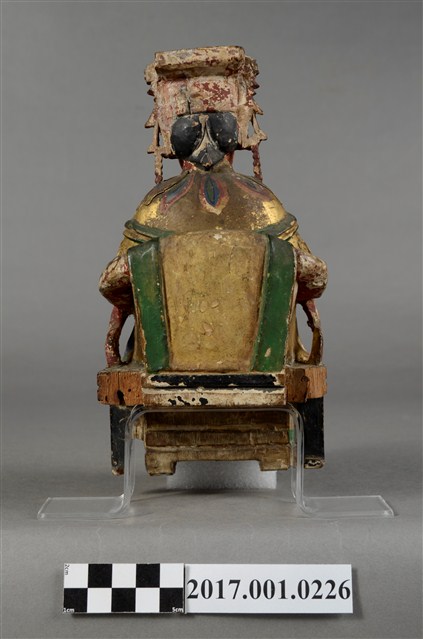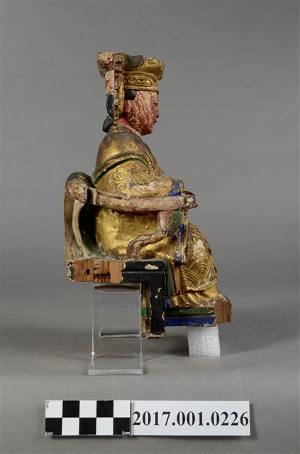 1.本件天上聖母像為木雕製成,表面以安金粉線彩繪粧佛。媽祖臉色紅潤,雙目垂視,五官清秀,神態慈祥,頭戴冕冠,冠後飾有垂珠,耳旁飾有鳳翅,腦後垂髮髻。媽祖身穿蟒袍披雲肩,腹下束腰帶,胸下有看帶,雙肘平靠於扶手,右手掌斷裂,左手扶靠扶手。神像手勢採平放式姿態,端坐於圈背椅,雙足踏於踏几上。蟒袍的蟒紋以粉線安金飾成。圈背椅後方雙足斷裂。