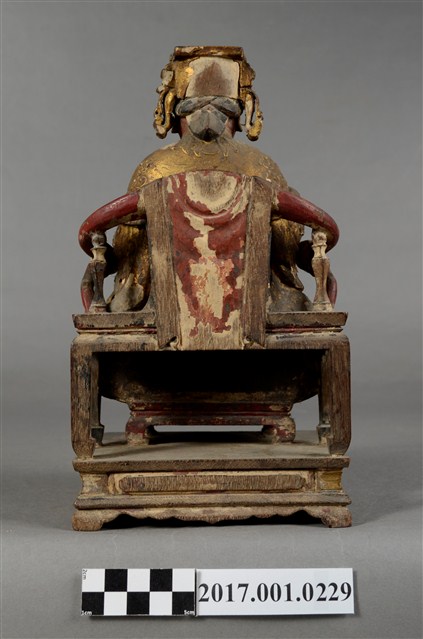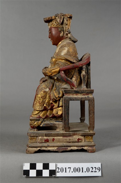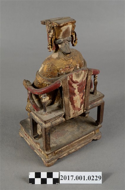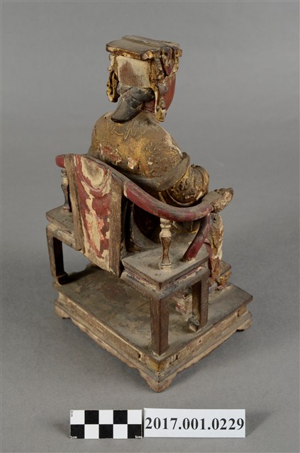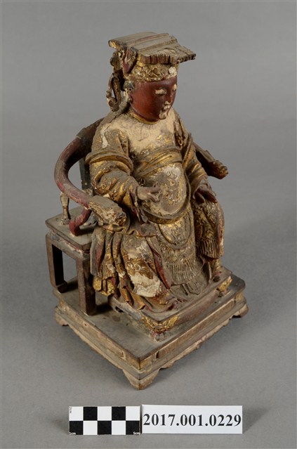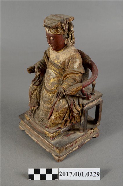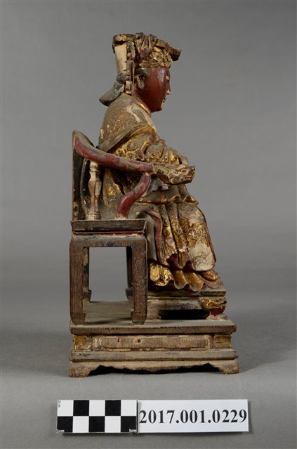 1.本件天上聖母像為木雕製成,表面以安金粉線彩繪粧佛。媽祖臉色赭紅,雙目垂視,面帶微笑,神態慈祥。頭戴冕冠,耳旁飾有鳳翅,身穿蟒袍,腹下束腰帶,胸前有看帶,雙肘平靠於扶手,右手掌朝上,神像作如意體,端坐於龍頭圈背椅,雙足踏於踏几上,蟒袍的蟒紋以粉線飾成。衣摺線條流暢生動。