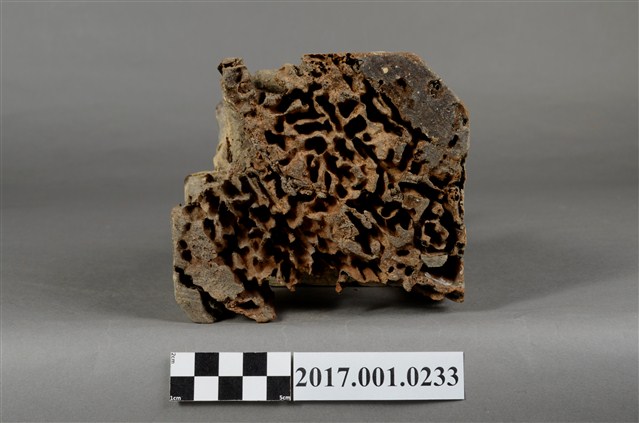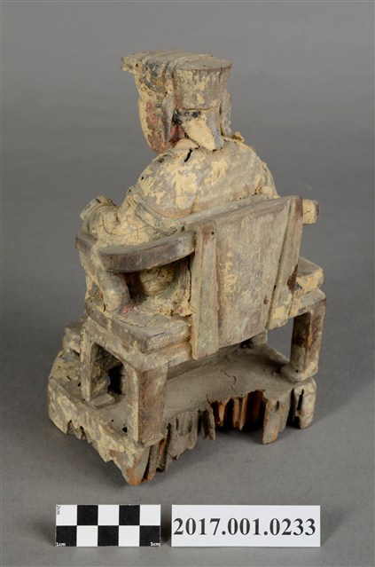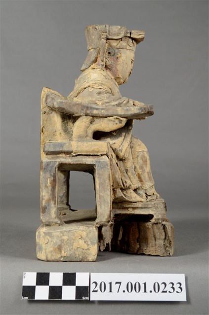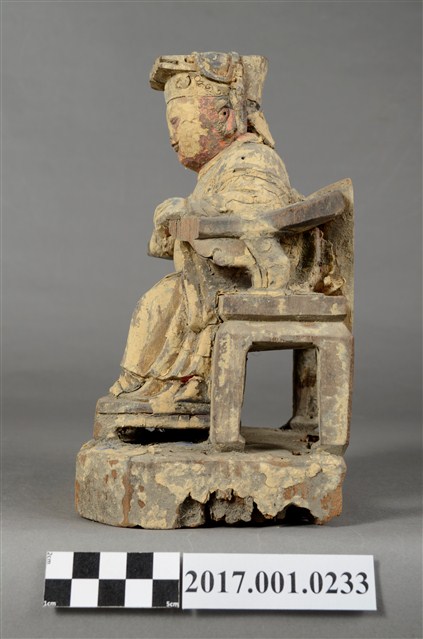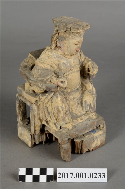 1.本件天上聖母像為木雕製成,表面粧佛已除去,神像臺座蟲蛀嚴重。媽祖雙目微睜,臉頰豐滿,面帶微笑,神情慈祥。頭戴冕冠,耳旁飾有鳳翅。身穿長袍披飄帶,腰束腰帶,胸下有看帶,雙肘平靠於扶手,右手掌虛握朝上,持物已失,左手掌平放扶手。神像手勢採平放式姿態,端坐圈背椅,雙足踏於踏几上。