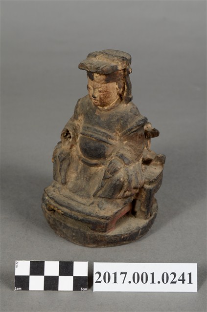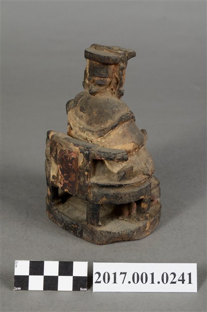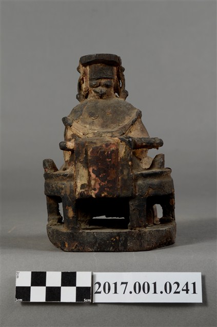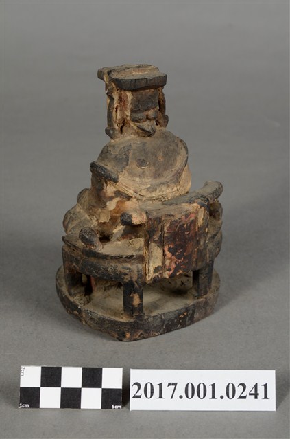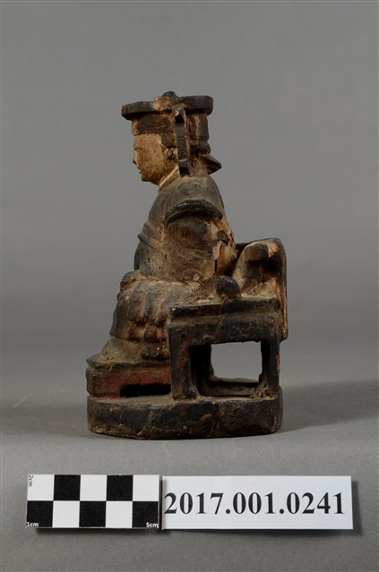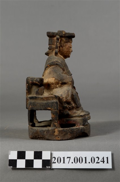 1.本件天上聖母像為木雕製成,表面粧佛已除去。媽祖面帶微笑,神情慈祥。頭戴冕冠,耳旁飾有鳳翅。身穿長袍披飄帶,腰束腰帶,胸下有看帶,雙肘平靠於扶手,右手掌削落,左手平放於左膝上。神像採如意體,端坐圈背椅,雙足踏於踏几上。