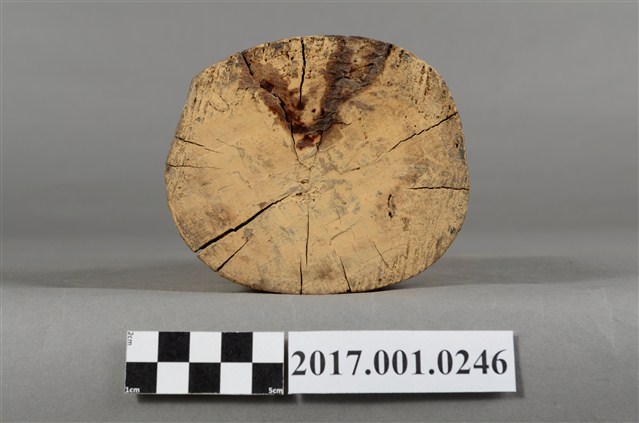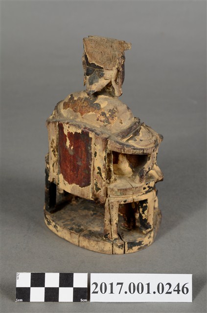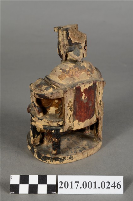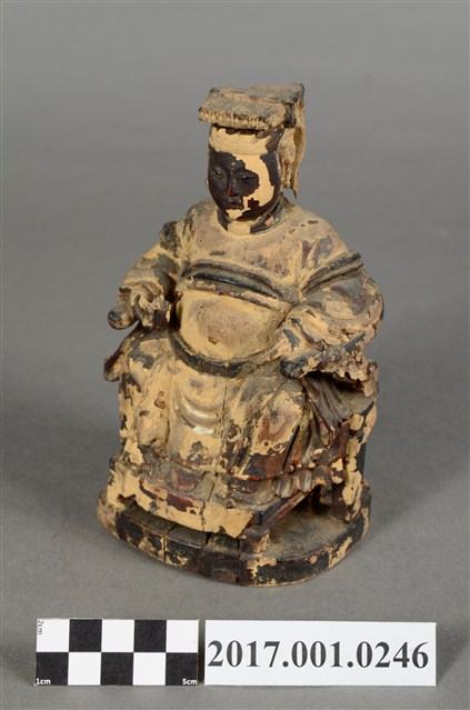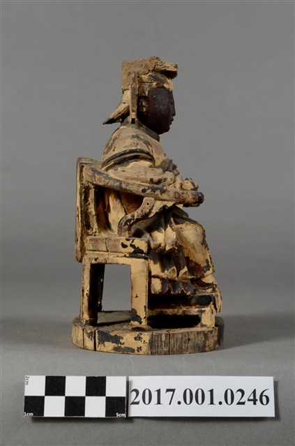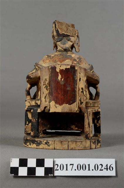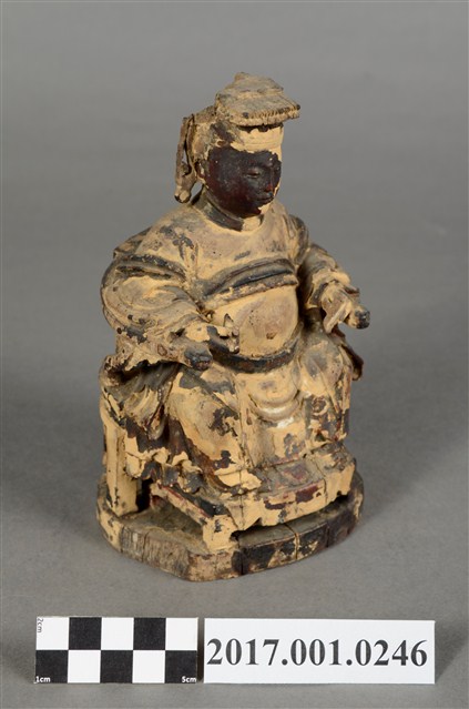 1.本件天上聖母像為木雕製成,表面粧佛已除去。媽祖臉色黝黑,雙目垂視,神情慈祥。頭戴冕冠,耳旁飾有鳳翅,身穿長袍披飄帶,腰束腰帶,胸前有看帶,雙肘平靠於扶手,右手手掌朝上,左手倚靠扶手上。神像作如意體,端坐圈背椅,雙足踏於踏几上,頭部右後方削落一部分。