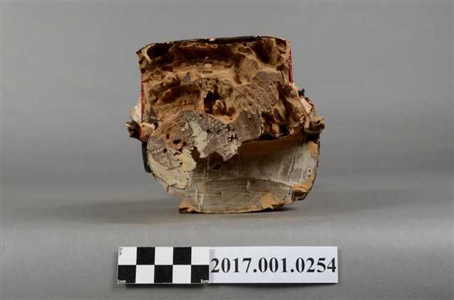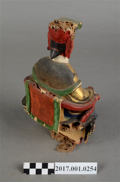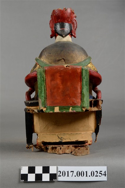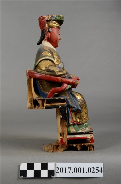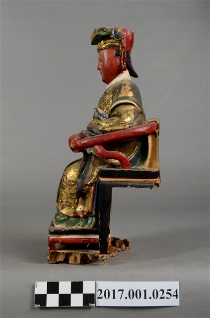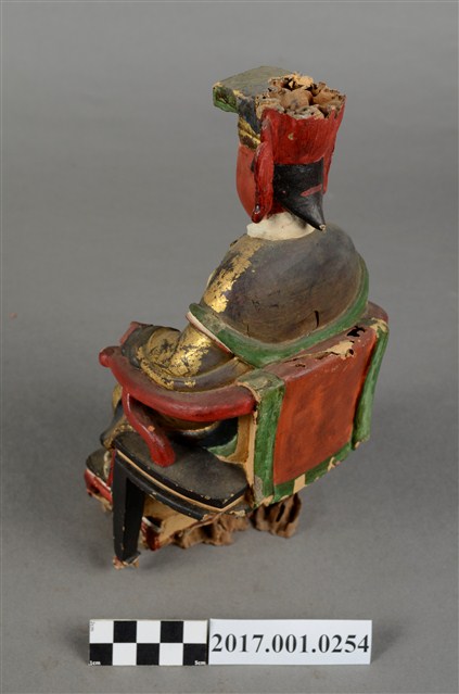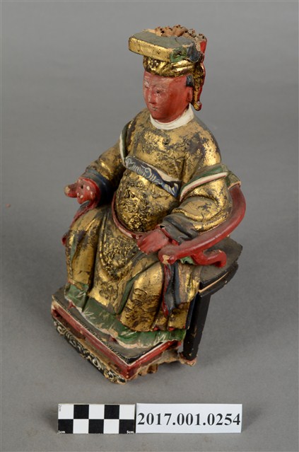 1.本件天上聖母像為木雕製成,表面以安金粉線彩繪粧佛。媽祖臉色粉嫩,五官以彩繪強調,雙目垂視,神態淡然,頭戴冕冠,耳旁飾有鳳翅。身穿蟒袍,腹下束腰帶,胸前有看帶,雙肘平靠於扶手,右手虛握掌朝上,持物已失,左手倚靠扶手。神像作如意體,端坐於圈背椅,後方椅腳斷裂,雙足踏於踏几上,蟒袍的蟒紋以粉線彩繪飾成。