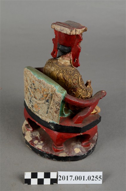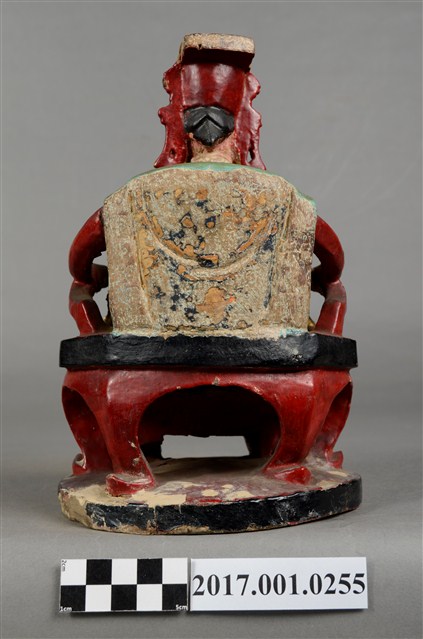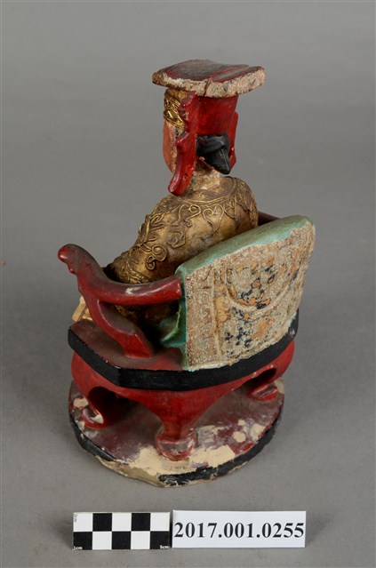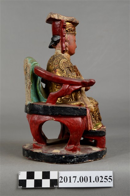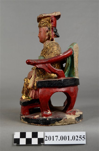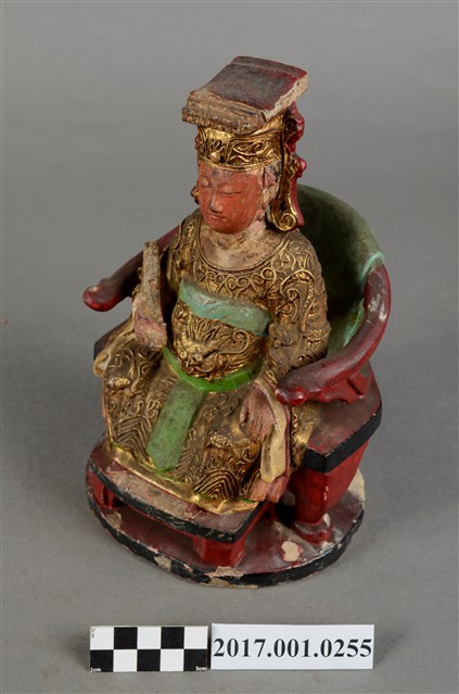 1.本件天上聖母像為木雕製成,表面以安金粉線彩繪粧佛。媽祖臉色粉嫩,五官以彩繪強調,雙目垂視,帶有淺淺微笑,神態慈祥。頭戴冕冠,以粉線描繪裝飾,耳旁飾有鳳翅。身穿蟒袍,以粉線勾勒全身紋樣,腰束腰帶,胸前有看帶,兩膝間垂蔽膝,腰帶、看帶及蔽膝作綠色。右手持笏,左手輕放於左膝上。神像作如意體,端坐於朱紅色圈背椅,雙足踏於踏几上,蟒袍的蟒紋以粉線彩繪飾成。