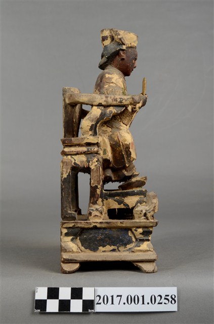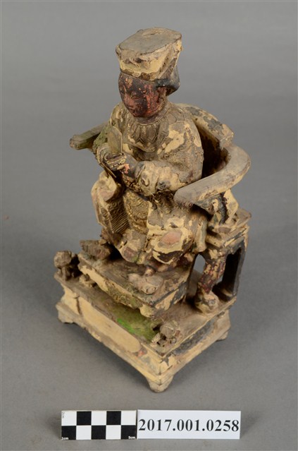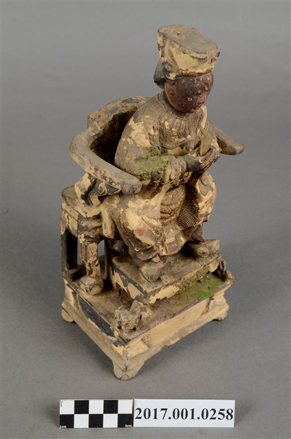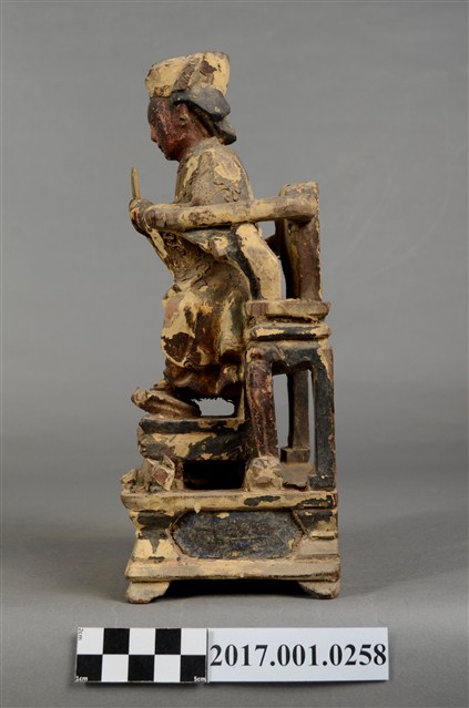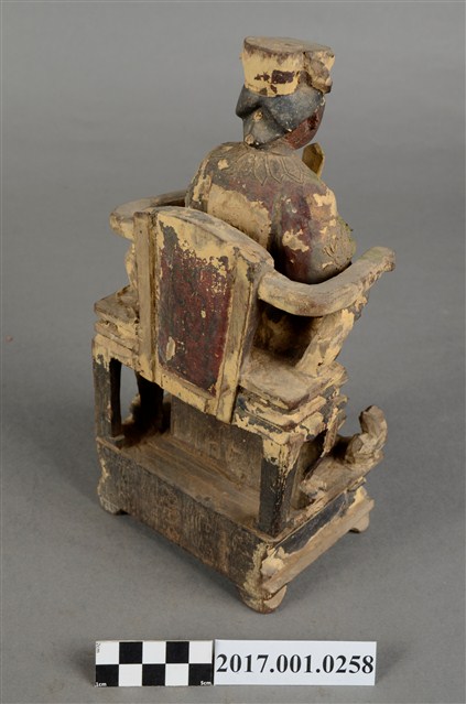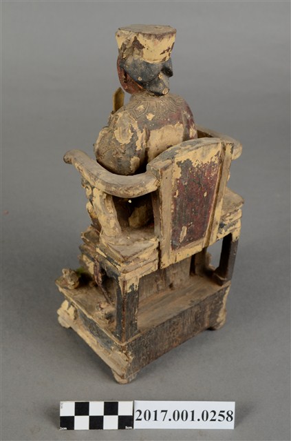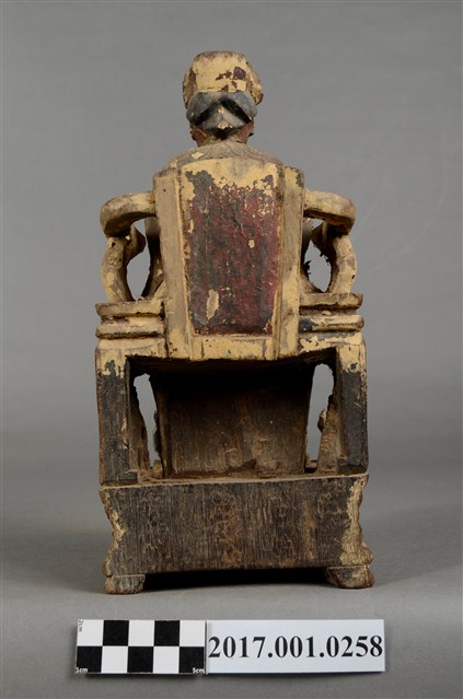 1.本件天上聖母像為木雕製成,表面以安金粉雕彩繪粧佛,部分粧佛脫落。媽祖臉色赭紅,雙目垂視,面帶微笑,神態慈祥。頭戴冕冠,冠旁飾有鳳翅,冠之前端磨損。身穿蟒袍,腰束腰帶,胸前有看帶,以粉雕勾勒全身紋樣,衣摺自然生動。媽祖雙手交握於胸前持圭,為朝天體式樣,端坐於圈背椅,雙足踏金獅,踏几底下有兩隻金獅裝飾。