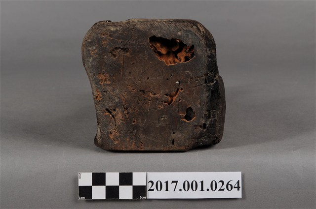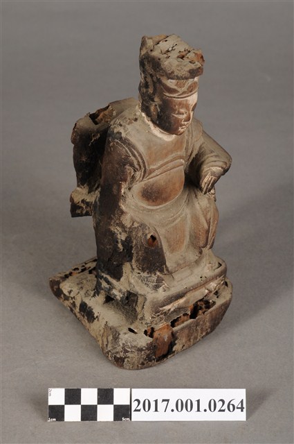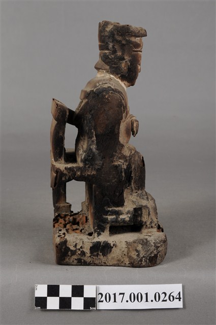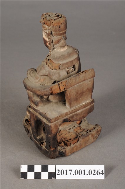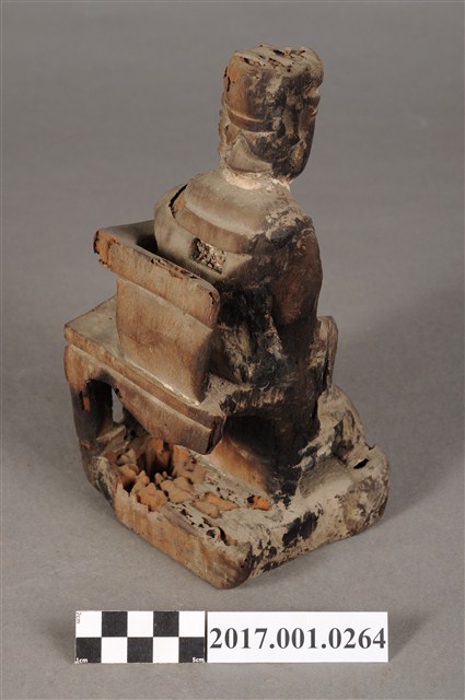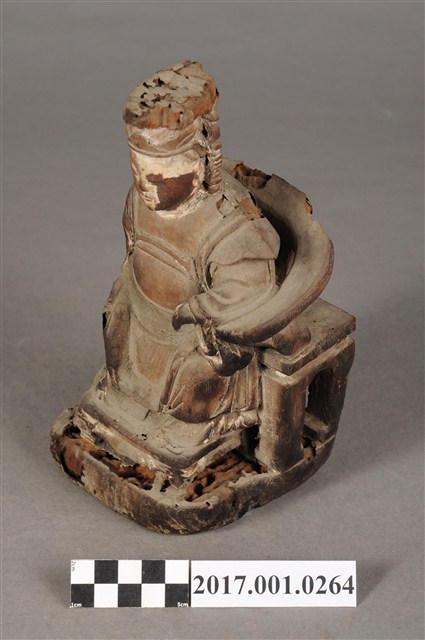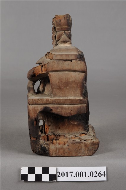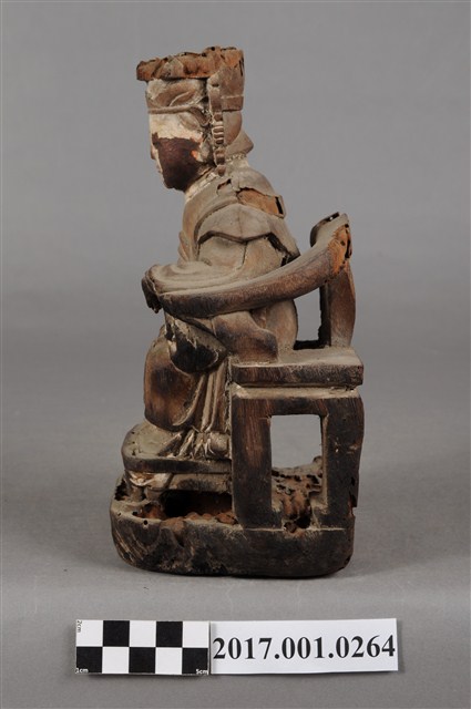 1.本件天上聖母像為木雕製成,表面粧佛已除去。神像背後有一方形入神洞,洞內有紙類填充物。媽祖雙目垂視,臉頰飽滿,神情沉靜安詳。頭戴冕冠,耳旁飾有鳳翅。身穿長袍披飄帶,腰束腰帶,胸前有看帶。右肩與座椅右側削去遺失,左手掌倚靠於扶手上。神像作如意體,端坐圈背椅,雙足踏於踏几上。