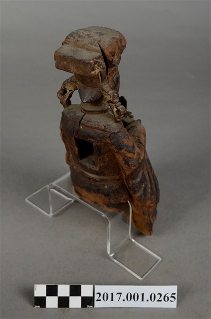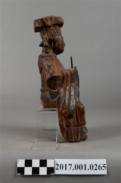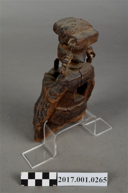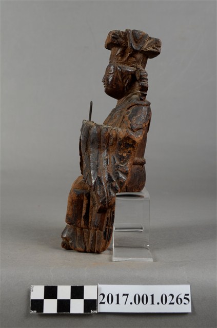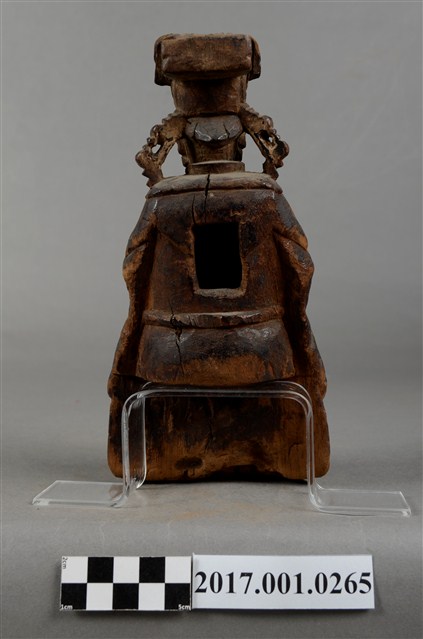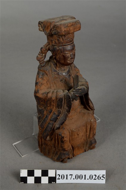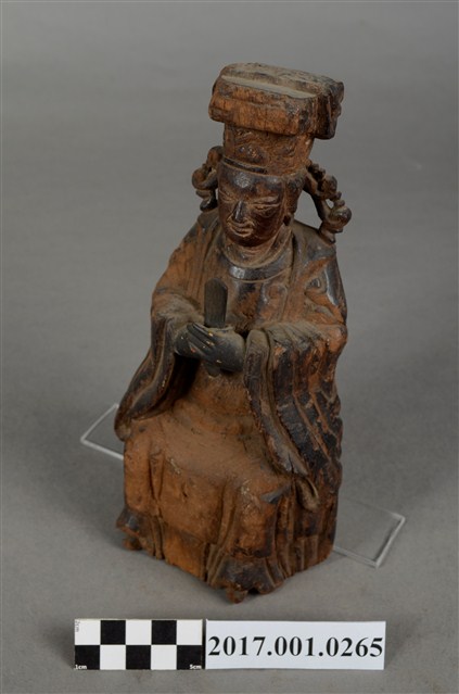 1.本件天上聖母像為木雕製成,表面粧佛褪去,神像背後有一方形入神洞,封榫佚失,內部物件已取出。媽祖雙目垂視,面帶微笑,神態慈祥。頭戴冕冠,耳旁飾有鳳翅。身穿長袍,衣摺自然流暢。雙手交握於胸前持圭,為朝天體式樣,採脫椅技法。