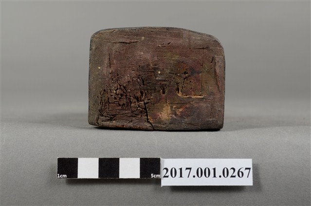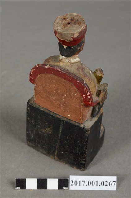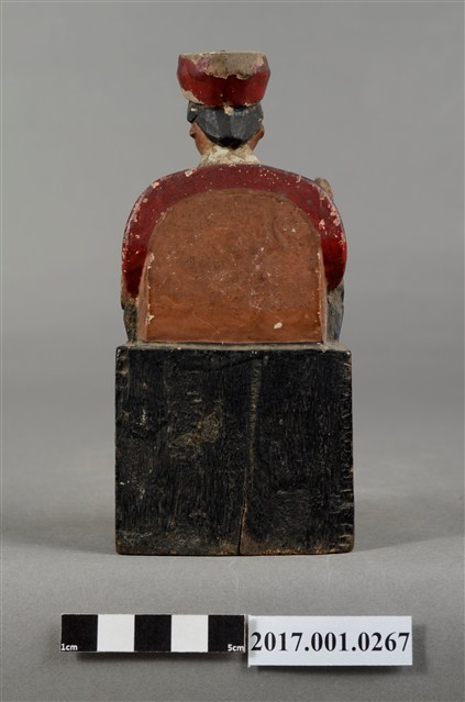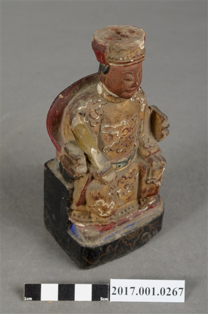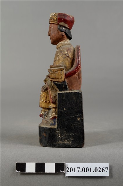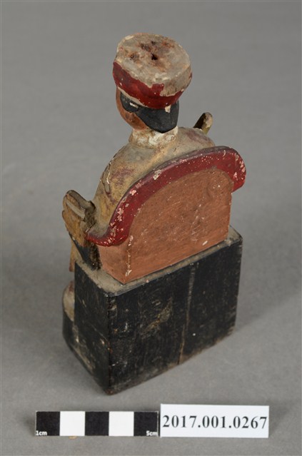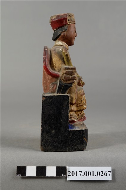 1.本件天上聖母像為木雕製成,表面以漆線彩繪粧佛,體積嬌小。媽祖粉面紅唇,雙目垂視,面帶微笑。頭戴后冠,身穿長袍,腰束玉帶。右手持笏,左手平放左膝。神像採平放式端坐於圈背椅,雙足踏於踏几上,長袍以漆線飾成雲紋,造形質樸。