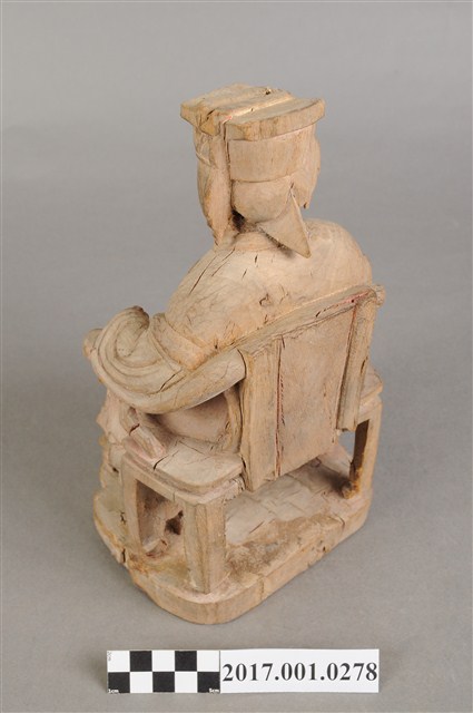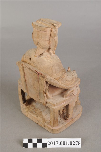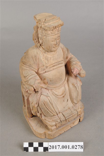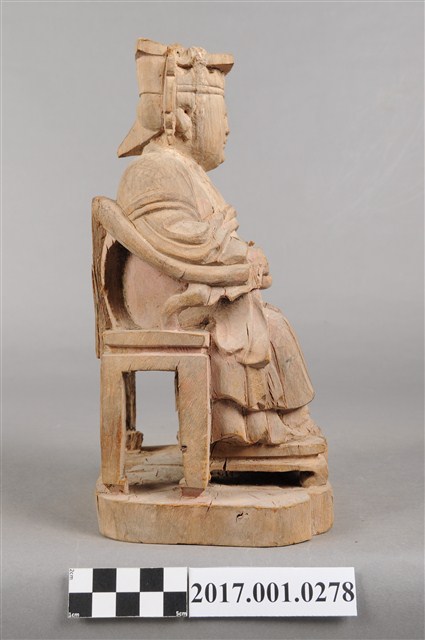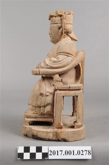 1.本件天上聖母像為木雕製成,表面粧佛已除去。媽祖雙目垂視,面帶微笑,神情恬淡安詳。頭戴冕冠,耳旁飾有鳳翅。身穿長袍披飄帶,腰束腰帶,胸前有看帶,雙肘平靠於扶手,右手掌朝上作托笏狀,持物已失,左手倚靠扶手。神像作如意體,端坐圈背椅,雙足踏於踏几上。