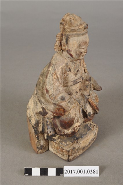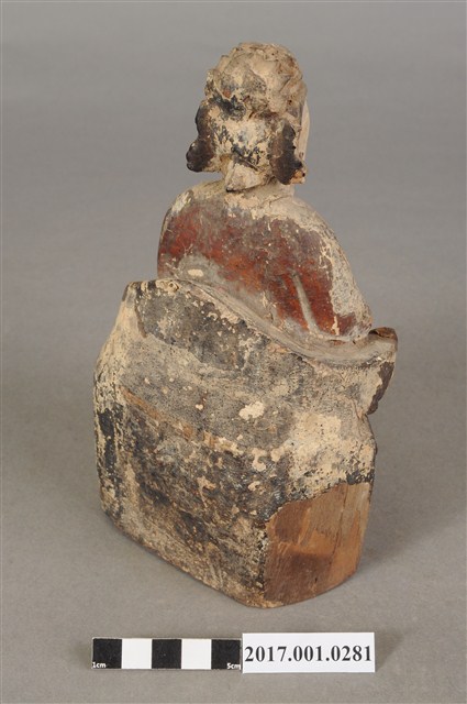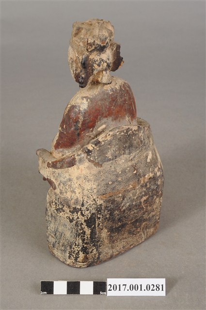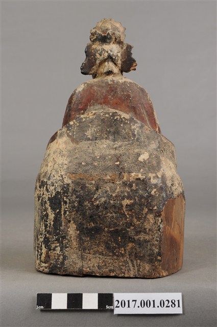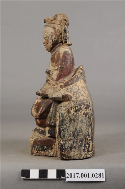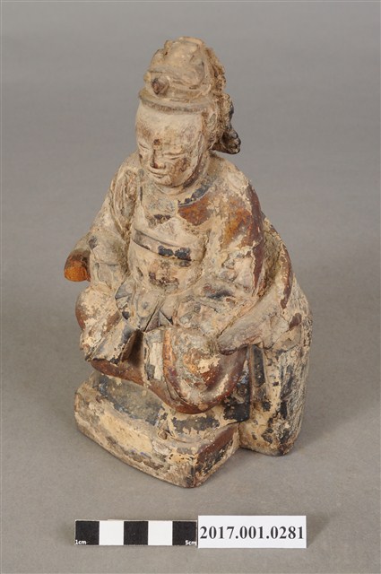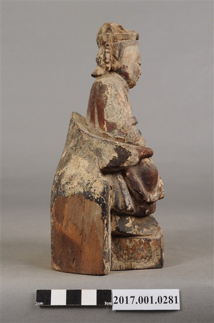 1.本件天上聖母像為木雕,表面粧佛除去。媽祖雙目垂視,面貌慈祥,低頭作傾聽貌。頭戴后冠,耳旁飾有鳳翅,身穿長袍,採抱袖體姿態,端坐於圈背椅之上。長袍衣摺線條流暢富層次感。