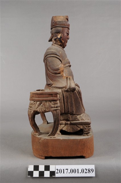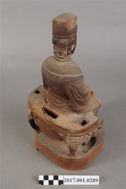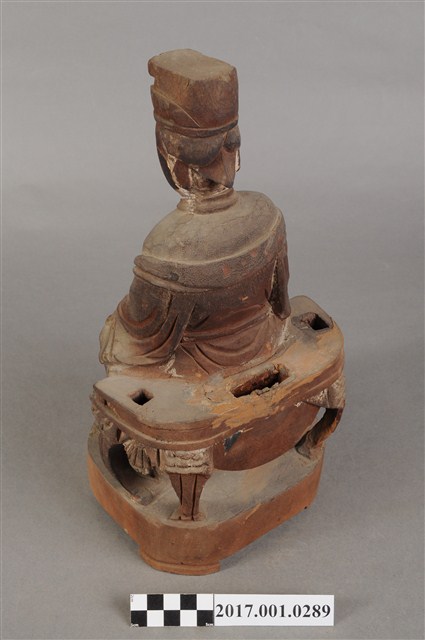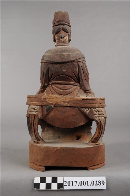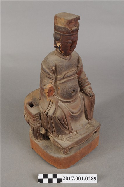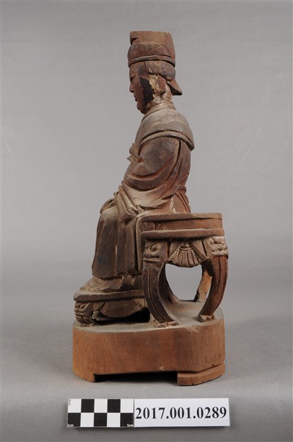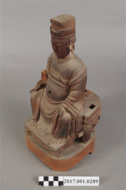 1.本件天上聖母像為木雕製成,表面粧佛已除去。媽祖五官立體,雙目細長,眼神垂視,嘴巴微張,神態莊嚴。頭戴后冠,身穿長袍披飄帶,腰束腰帶,胸前有看帶,腹部有一圓洞。媽祖雙肘平靠於扶手,右手削落,左手輕放於左膝上。神像作如意體,端坐圈背椅,椅背與扶手皆遺失,雙足踏於踏几上。臺座底部有被挖鑿,應是被作為藥引使用。