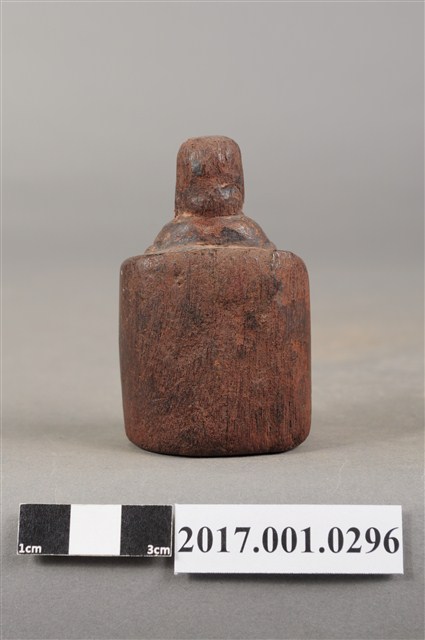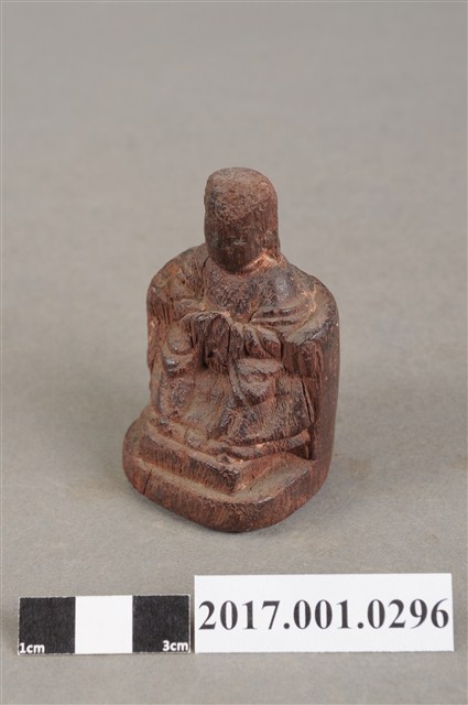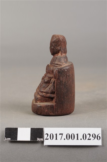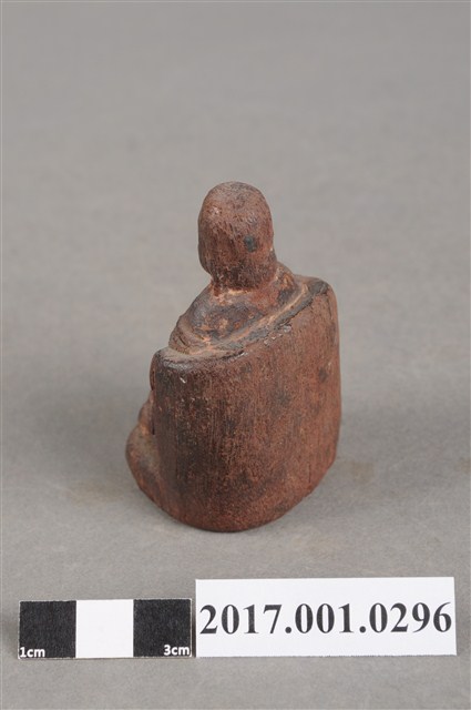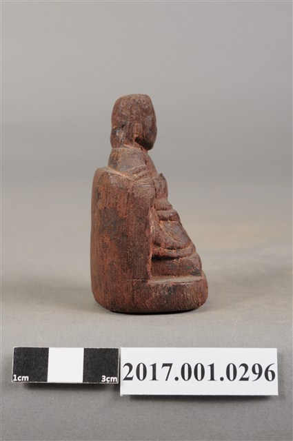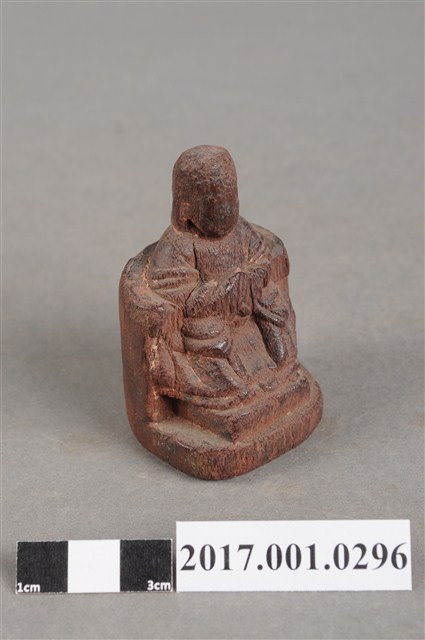 1.本件天上聖母像為木雕製成,尺寸微小,表面粧佛已除去。媽祖頭部模糊不清,戴平帽。身穿長袍披飄帶,雙手交握於胸前,手掌隱於袖內作持圭狀,圭板磨損。神像採朝天體姿態,端坐圈背椅,雙足踏於踏几上。