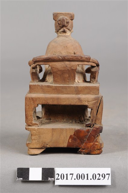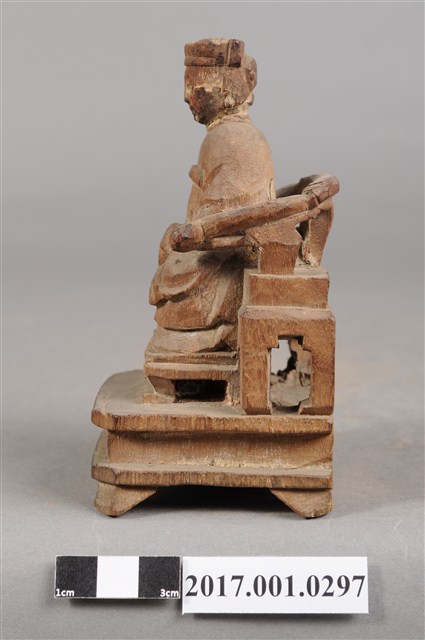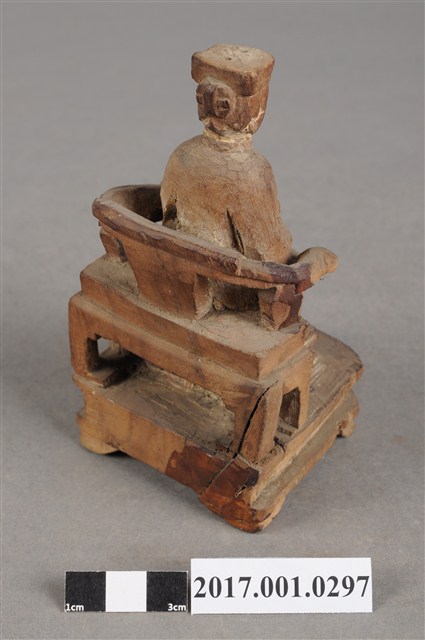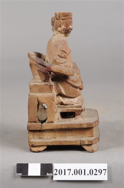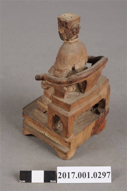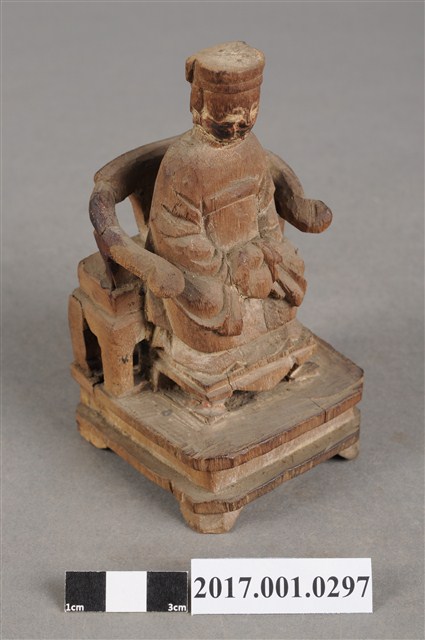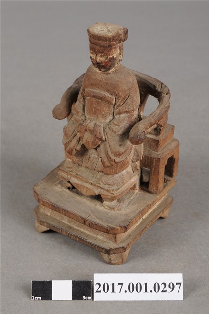 1.本件天上聖母像為木雕製成,尺寸微小,表面粧佛已除去。媽祖戴冕,五官模糊不清。身穿長袍披飄帶,胸前有看帶,衣摺流暢,雙手交握於腹前,手掌隱於水袖內。端坐圈背椅,雙足踏於踏几上。