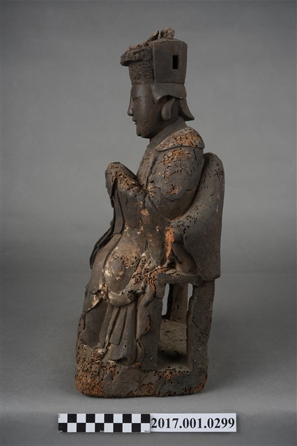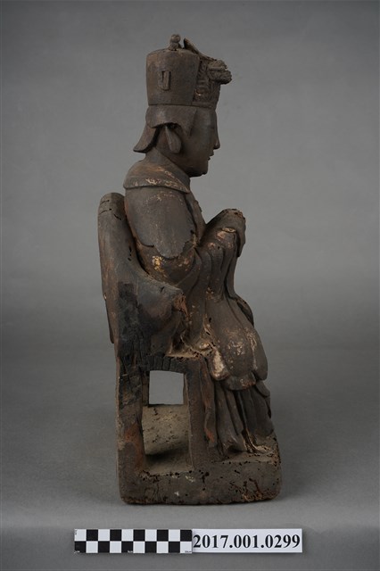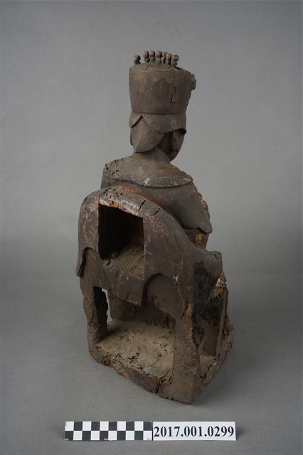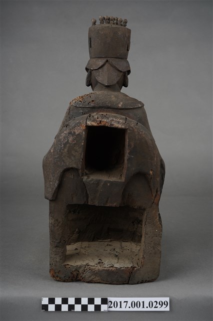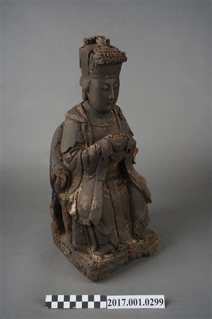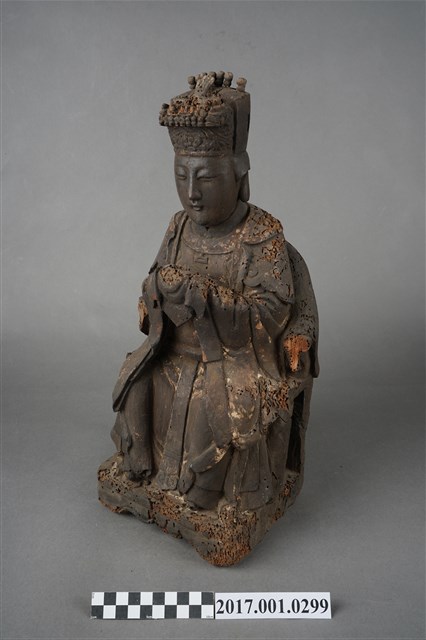 1.本件天上聖母像為木雕製成,表面粧佛已褪去,圈椅扶手出頭蛀蝕。神像背後有一方形入神洞,封榫佚失,內部物件已取出。媽祖雙目垂視,面帶微笑,神態慈祥。頭戴冕冠,冕兩側有方孔可插鳳翅。身穿長袍,肩部飾有雲紋,衣摺自然流暢,腰束腰帶,兩膝間垂劍帶式蔽膝。雙手交握於胸前,手掌隱於水袖內,作持圭狀,為朝天體式樣,圭板蛀蝕。
