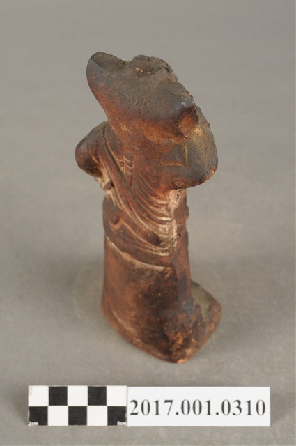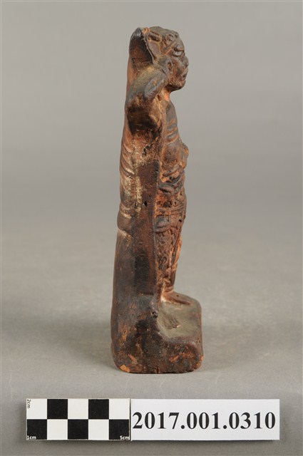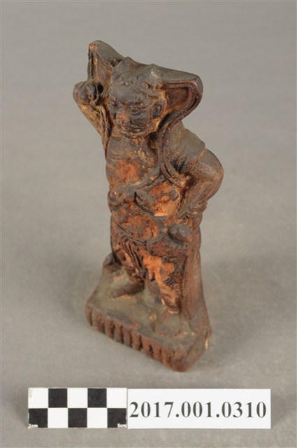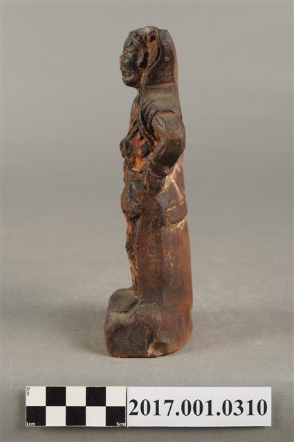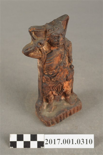 1.本件順風耳像為磚燒。順風耳,直立作側耳傾聽貌,頭戴金箍,披頭散髮,眼睛瞪大,面目猙獰。順風耳身穿半甲,身披飄帶,裸露胸膛與右肩,下身穿著束腰盔甲,雙腳跣足踩於臺座,姿態生動。順風耳右臂抬起指耳朵,左手則持握鉞斧。