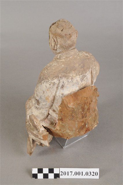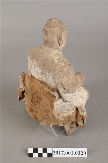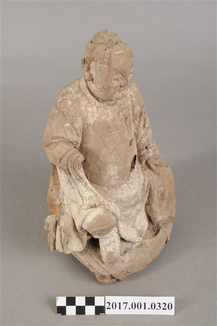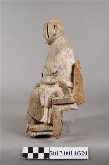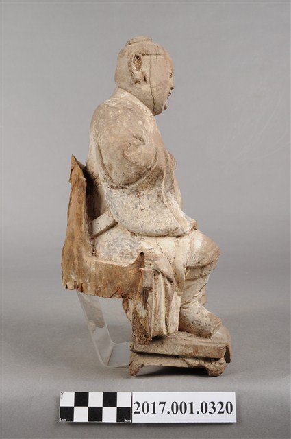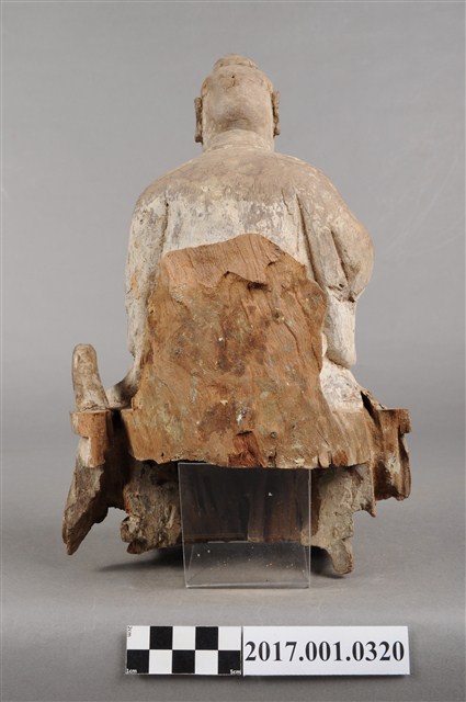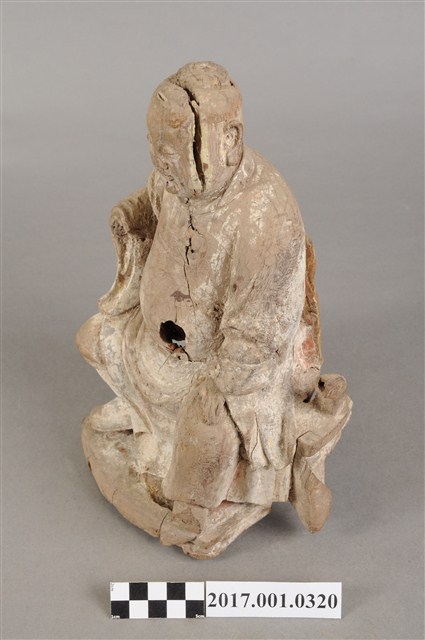 1.本件木雕中壇元帥像,作坐姿姿態,坐於圈背椅上,表面粧佛已褪去,神像左臉、左胸有裂痕,左腹有破洞,底部蛀蝕嚴重,身軀內部蛀空。元帥臉型輪廓橢圓、豐潤,雙眼半睜。頭頂梳髮髻,身著鎧甲,外套著盤領衣,肚腹圓凸,腳穿皂靴。挺身端坐,雙足垂下,左腳向斜前方外推、右腳向內,作「文武腳」坐姿,右腳內縮露出鎧甲,左手掌向下置於腿上,右手掌向上,右手掌損毀。圈背椅的椅背披著坐布,圈背椅的扶手損毀,椅前有踏几。