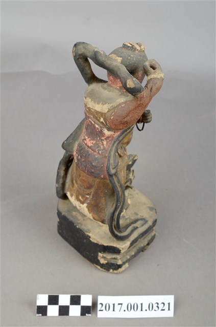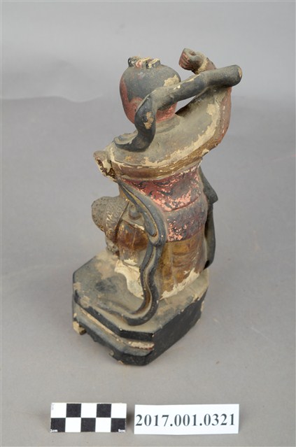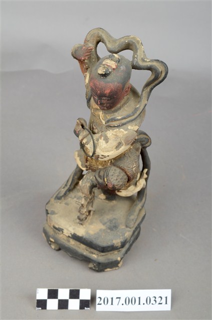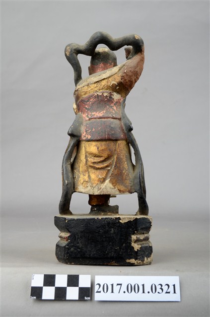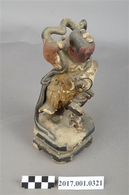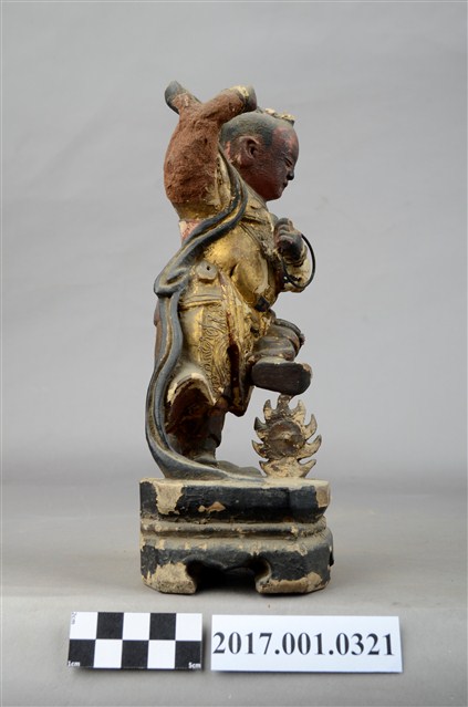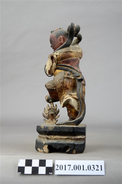 1.本件木雕中壇元帥像,作立姿姿態,表面施作塗裝、安金不見紅粉線盤飾粧佛技法,局部剝落。元帥作少年童子相貌,臉色絳紅,五官呈現稚氣,雙目半睜。頭頂梳單髻,身著寬袖袍,肩上披護肩、飄帶,飄帶自兩脅垂於臺坐上腰束腰帶,護腹以腰帶固定,腰帶下有左右擋,衣袖下襬向上揚起,雙足著長褲,腳穿皂靴。左手握拳持乾坤圈橫伸向右,右手握拳持物高舉,持物遺失。左腳向前抬起踏風火輪,右腳在後踏地。臺座作束腰方臺,前方兩端雕几腳。