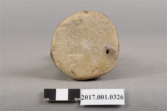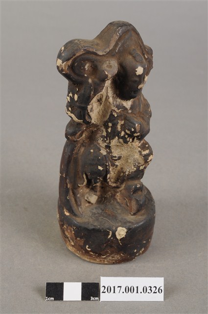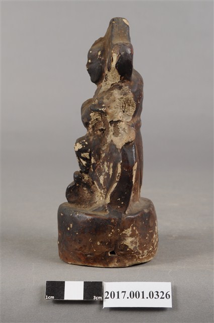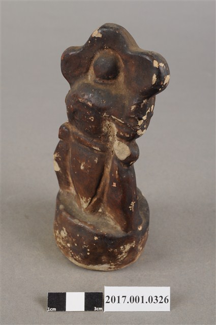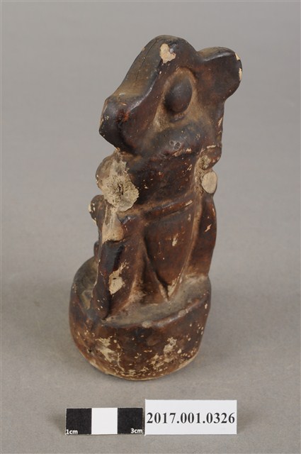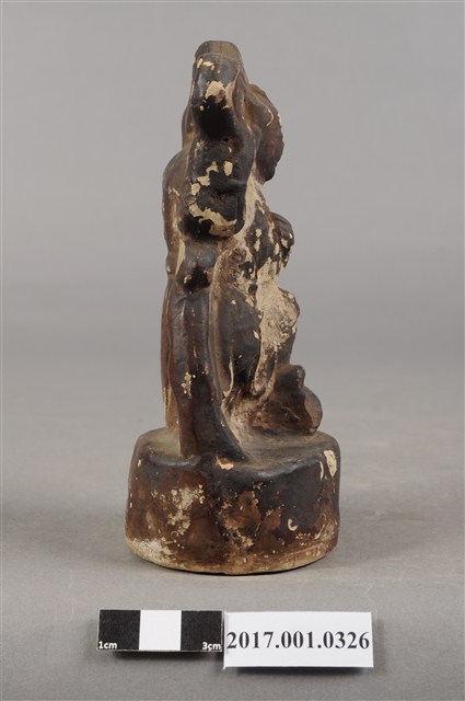 1.本件磚燒中壇元帥像,作立姿姿態,表面佈滿污漬,局部脫落。元帥作幼年童子面相,臉型輪廓橢圓,五官呈現稚氣貌。頭頂梳單髻,身著寬袖長袍,披飄帶,腰繫腰帶,雙足著長褲,腳穿皂靴。立像挺身,左手握拳持物橫伸向右,右手握拳持物高舉,持物遺失。左腳在前踏風火輪,右腳在後踏於臺座。