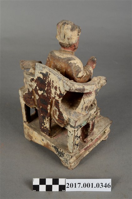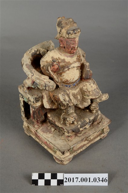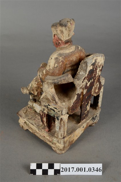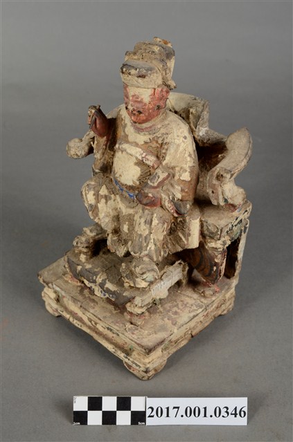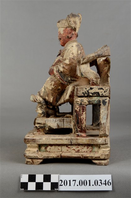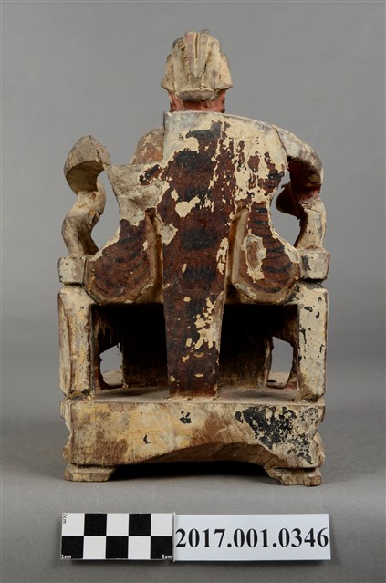 1.本件木雕文昌帝君像,作坐姿姿態,坐於圈背椅上,表面施作塗裝、安金不見紅粉線盤飾粧佛技法,局部粧佛剝落。顏面表現雙目半睜,鼻翼兩側、下顎、兩頰有植鬚孔,鬍鬚已失。頭戴冀善冠,冠上有額子,身著盤領衣,肚腹圓凸,腰束腰帶,胸前有看帶,腳穿皂靴。挺身端坐,雙足垂下,左腳向斜前方外推、右腳向內,雙腳蹬著兩獅獸座,作「文武腳」坐姿,左手掌托著書卷,右手持毛筆。圈背椅椅背以木雕、彩繪的方式表現椅背披著虎皮,屬於四獸圈背椅,椅前放置踏几,踏几雕刻螭虎吞腳。椅下的臺座為案几形式。