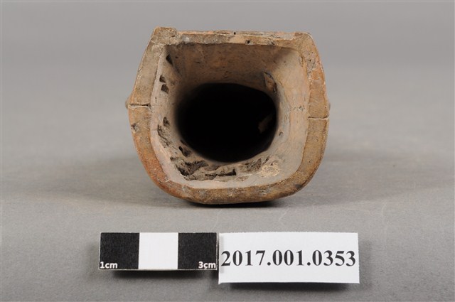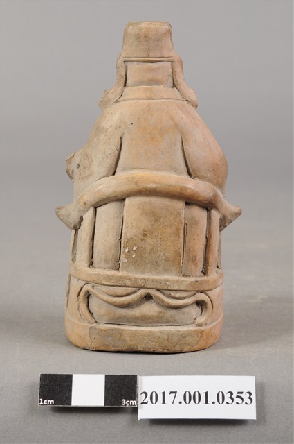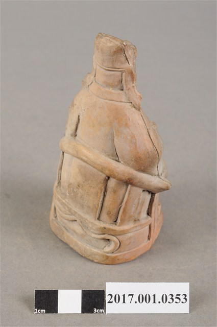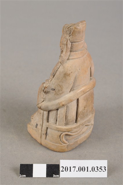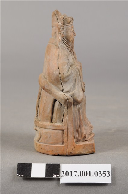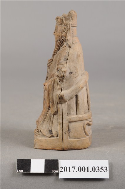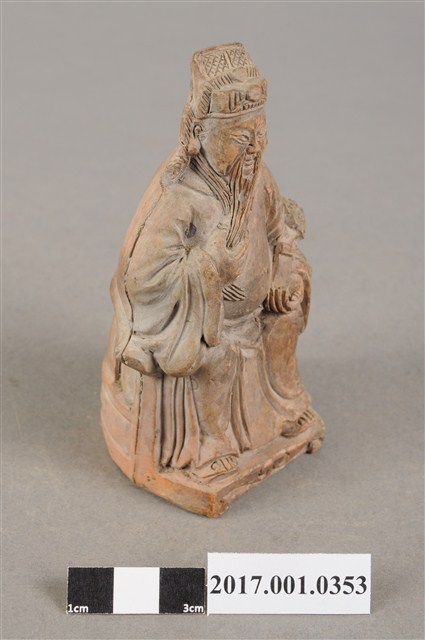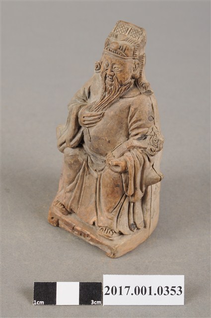 1.本件磚燒文昌帝君像,作坐姿姿態,表面之平塗漆面已剝落。顏面表現雙目半睜,鼻翼兩側、下顎、兩頰有鬍鬚。頭戴雙翅幞頭,幞頭帽翅作如意形狀,垂於兩肩上方。身著寬袖盤領衣,腰束腰帶,腳穿皂靴,坐於圈背椅上。挺身端坐,雙足自然垂下,左手托著如意,右手向上拂鬚。圈背椅的椅前有踏几,身軀內部挖空。本件判斷為文昌帝君,在於自明代《三教源流搜神大全》所刊刻的版畫,文昌帝君皆作文人士子形象,一手托著如意。這類磚燒神像的風格,應為戰後翻模製造。