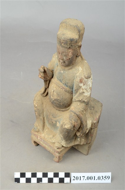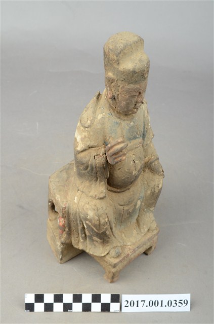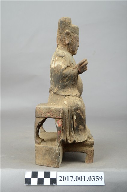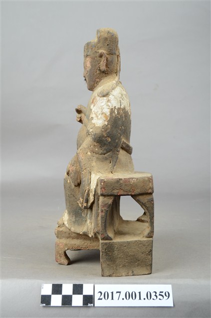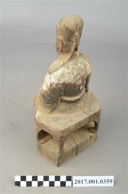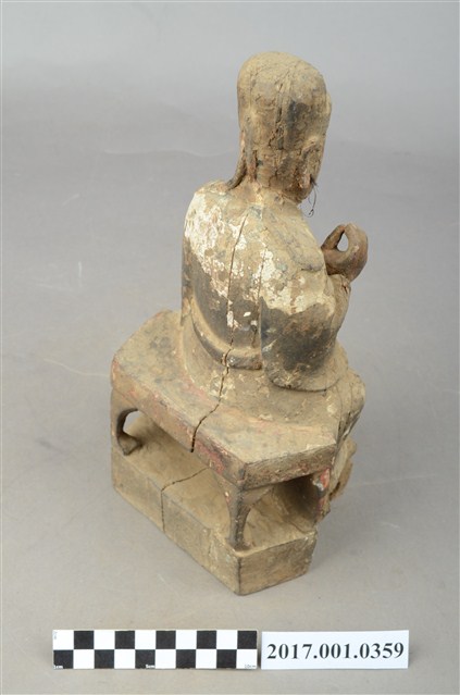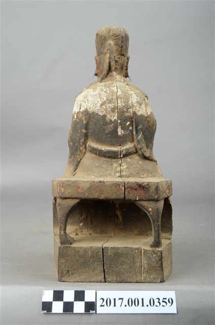 1.本件木雕文昌帝君像採坐姿,帝君端坐於椅凳上,表面佈滿灰塵污漬,粧佛局部破損,鬍鬚脫落。帝君像作中年男子相帽,臉型圓潤,五官斯文,嘴部上方兩側、下頷及兩腮鑿有小圓洞,為植鬍鬚處,兩腮殘留少量鬍鬚。頭戴幞頭,身著官袍,腹部凸出,腹下束腰帶,腹上又有看帶。左手下垂置於左膝之上,右手小臂上舉,手指虛握,手中持物已失,雙腳踩於踏几上,露出鞋尖。