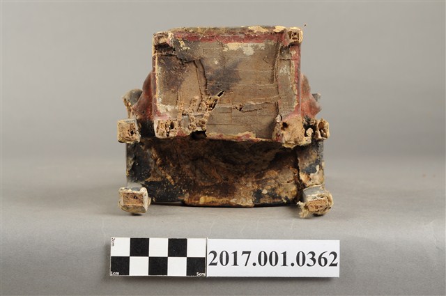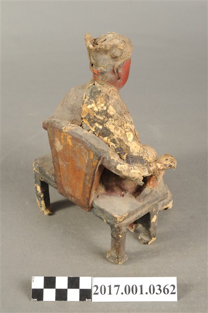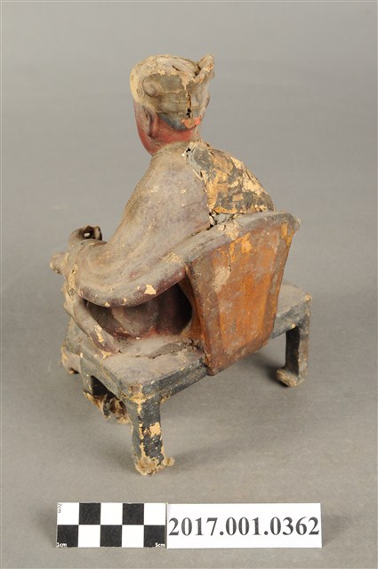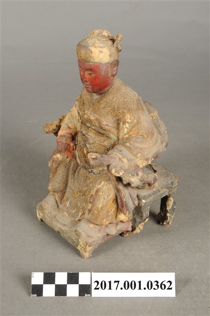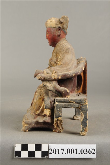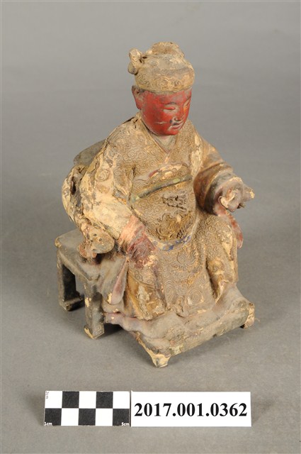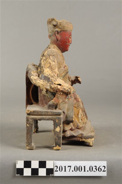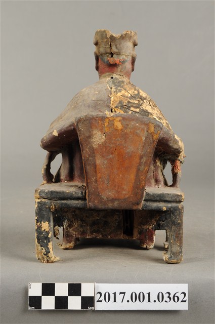 1.本件木雕文昌帝君像採坐姿,端坐於圈背椅上,表面粧佛局部脫落,鬍鬚脫落,冠頂缺損右背及座椅右扶手粧佛破損。帝君像作中年男子相貌,朱紅色臉,嘴部上方兩個小圓洞,下頷中央一個小圓洞,為植鬍鬚處。頭戴幞頭,身著斜襟蟒袍,袍服表面粉線裝飾細緻,腹下束腰帶,腹上又有看帶。左小臂倚於扶手上,手掌朝上握笏板,笏板前後端缺損,右手扶於右膝之上,雙腳平踏於座前踏几上。