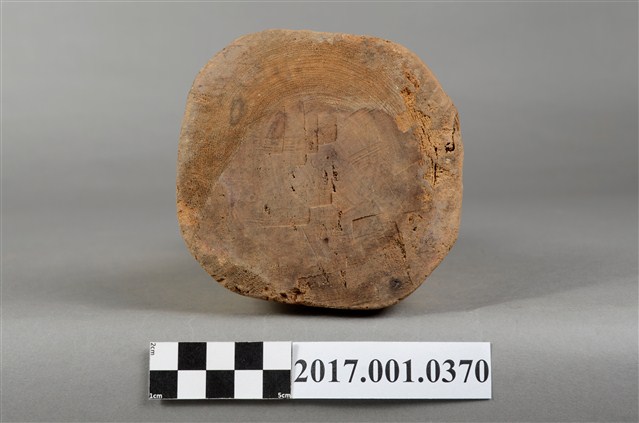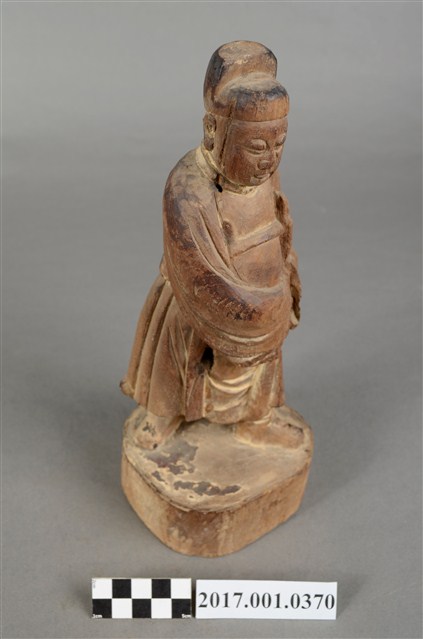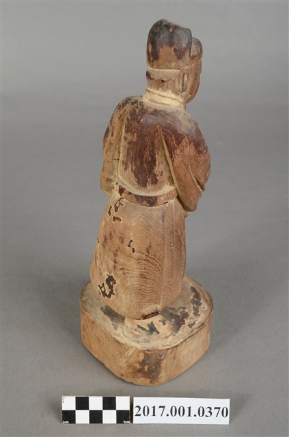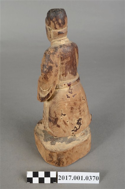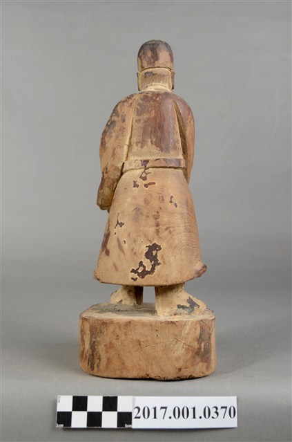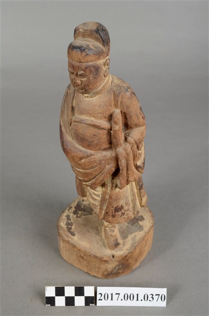 1.本件木雕文判官像,作立姿姿態,表面粧佛已除去,右臉有刀痕,頸部右側與袍服下襬右上方有蛀蝕洞。雙目半睁。頭戴無翅幞頭,身著盤領衣,腹肚圓凸,胸前束看帶,腳穿皂靴,下半身表現出袍服一層層的衣折紋路。立像挺身以雙腳丁字步的姿態站於臺座上,左腳在前、右腳在後,身軀向前傾,雙手藏於袖內,右手左伸,雙手環抱於腰際,此種體態稱為抱袖體或通壽體,雙手握著書卷,書卷靠著左側身軀。臺座為圓臺。