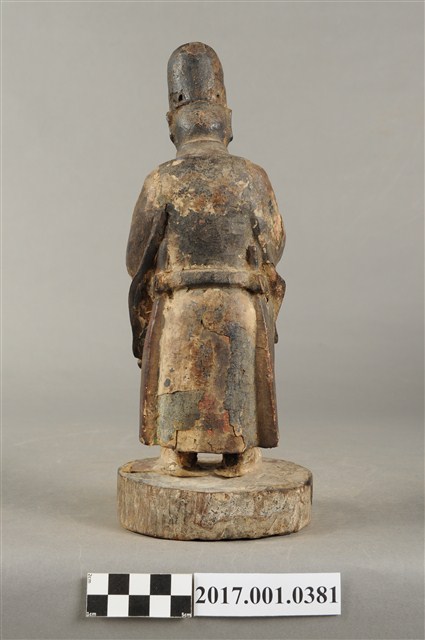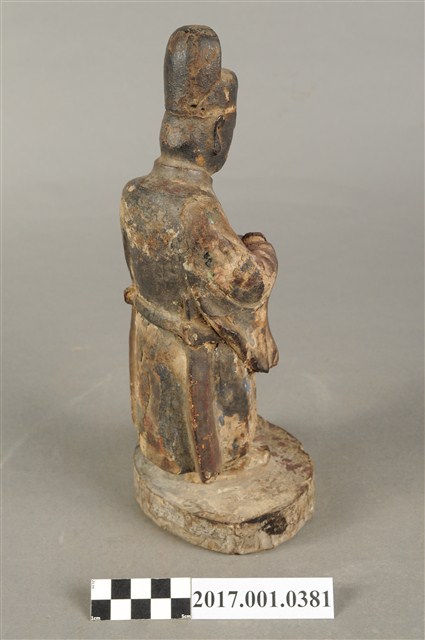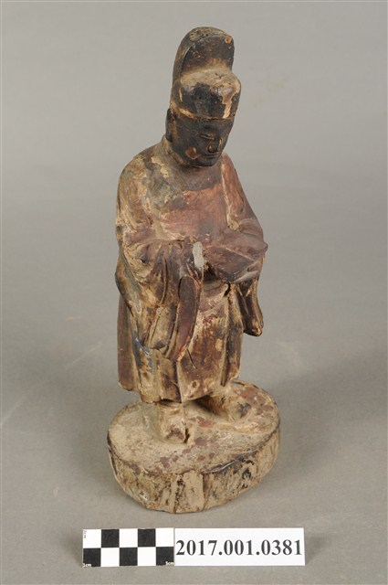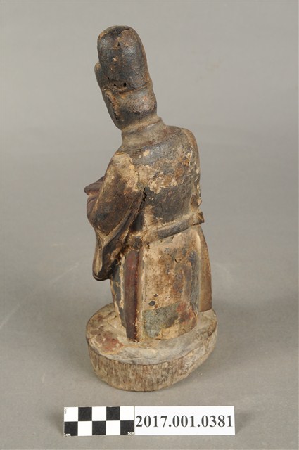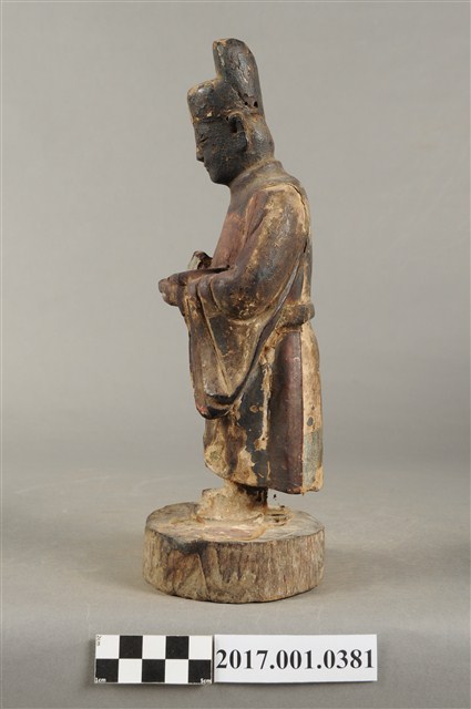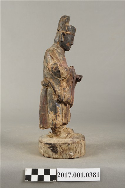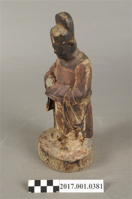 1.本件木雕文判官像,作立姿姿態,表面施作塗裝粧佛技法,粧佛局部剝落。雙目半睁。頭部略為低頭作俯視狀。頭戴幞頭,幞頭後有孔,推測原有組裝帽翅。身著盤領衣,衣袖向下垂形成多道衣折紋路,腰繫腰帶,腳穿皂靴。立像挺身以雙足分立的姿態站於臺座上,左手右伸捧著攤開的書冊,右手左伸,手掌損毀缺損。