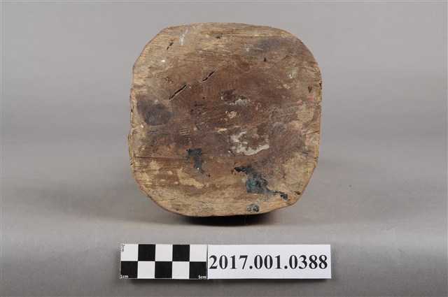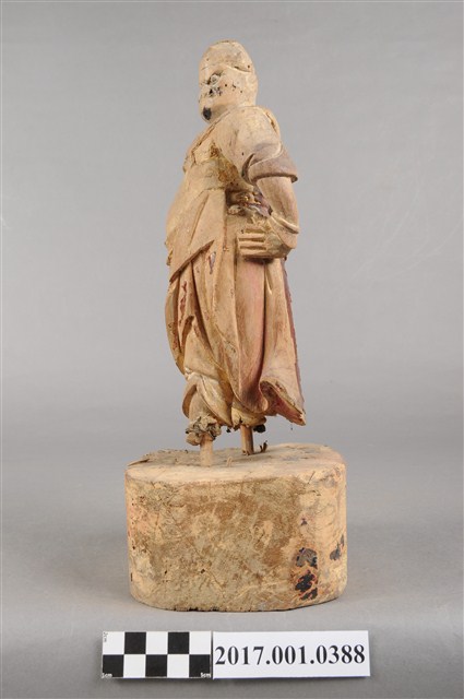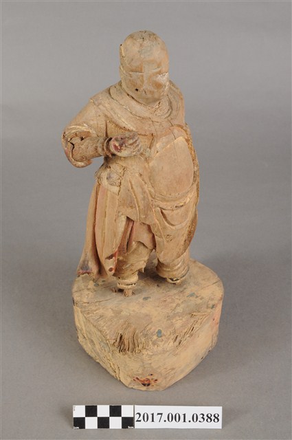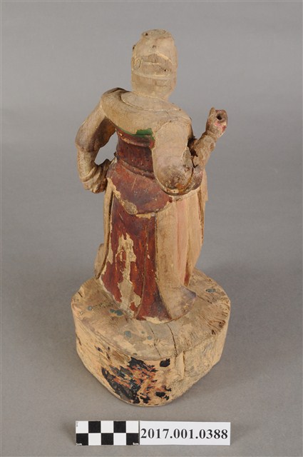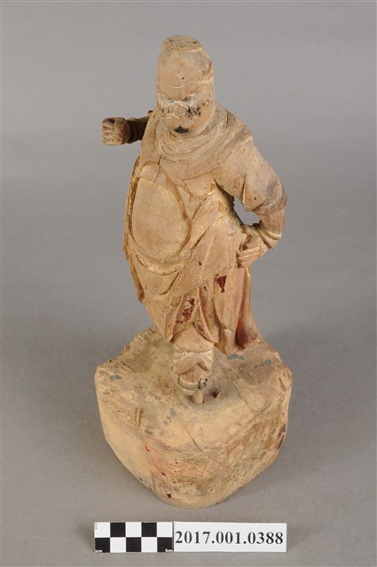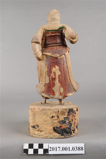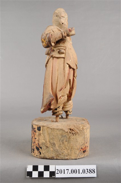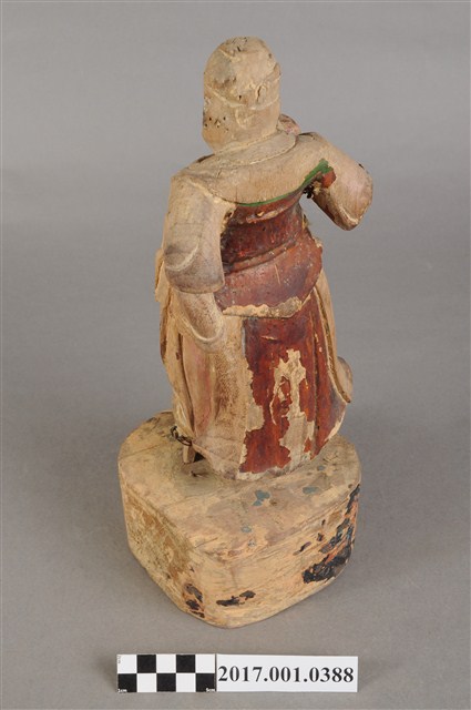 1.本件木雕武判官像,作立姿姿態,雙腳已損毀缺損,造像的軀體於左腳腳踝處纏繞鐵絲,並於雙足插入木籤使軀體固定於臺座,表面僅存背面尚存部分安金。頭部微側向左,雙眼瞠目,皺眉,顴骨與頦肌凸出,表現出嗔怒的相貌。頭戴圓巾,身著窄袖盤領衣,肩披布巾,肚腹圓凸,腹束腰帶,胸前有看帶,雙足著長褲,腳穿皂靴。立像挺身站於臺座上,左手插腰、右手握拳持物向前,持物已失。