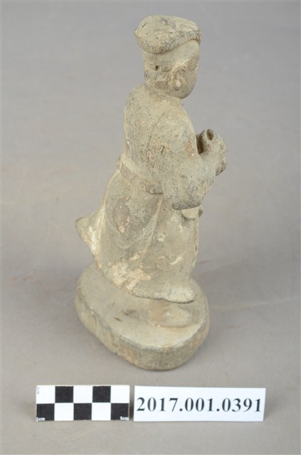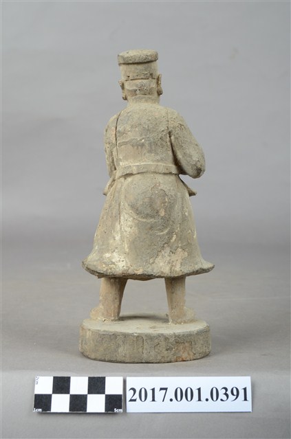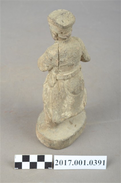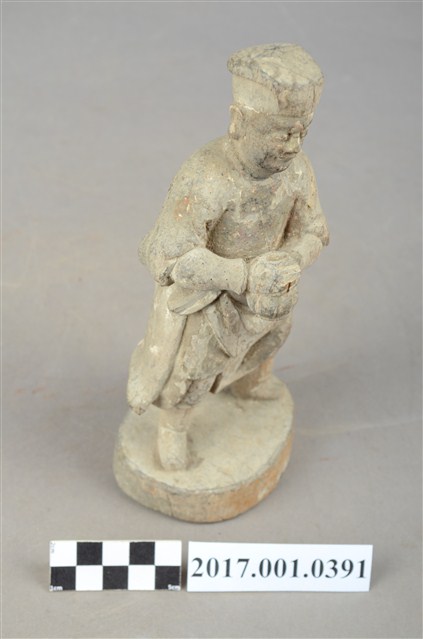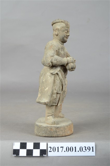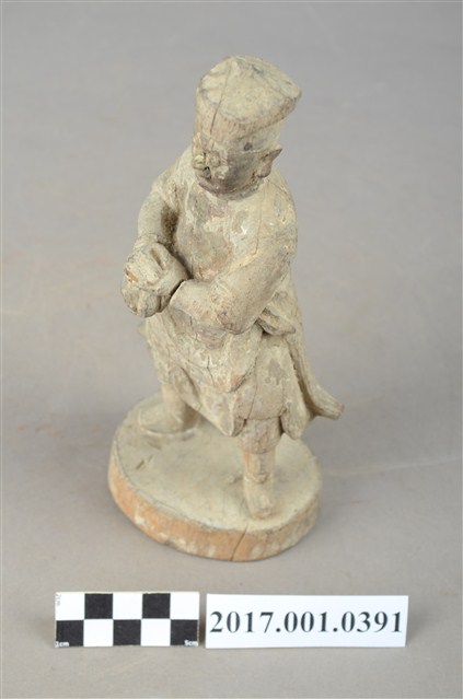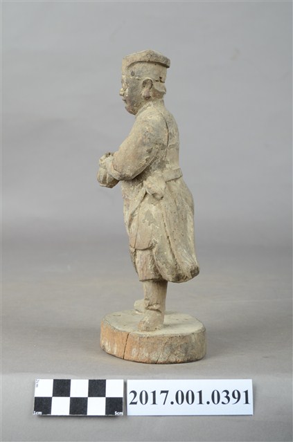 1.本件木雕武判官像,作立姿姿態,表面粧佛已褪去。頭部微側向左,雙眼瞠目,皺眉,表現出嗔怒的相貌。頭頂戴方巾,身著窄袖盤領衣,腰繫腰帶,雙足著長褲、綁腿,腳穿皂靴,下半身表現出袍服一層層的衣折紋路。立像挺身以雙足分立的姿態站於臺座上,身軀微側向左側,雙手臂橫胸前,手掌相疊按著瓜槌,瓜槌下方之握柄已斷裂缺損。臺座平面近似圓形。