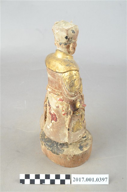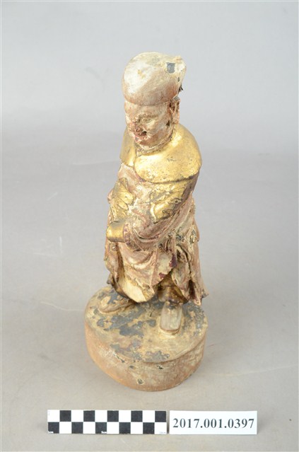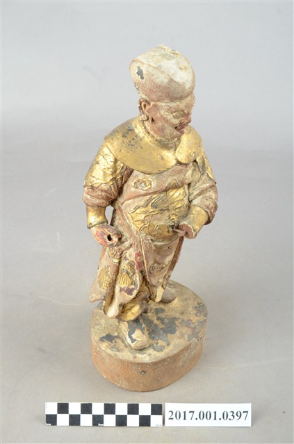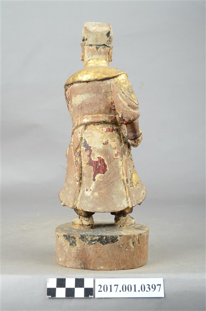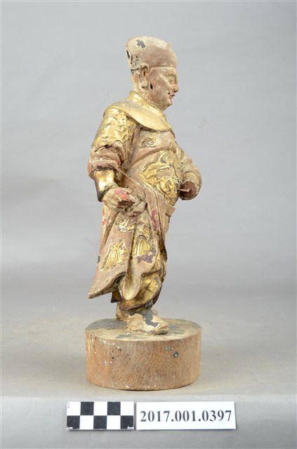 1.本件木雕武判官像,作立姿姿態,表面施作塗裝、安金不見紅粧佛技法,安金層局部脫落。雙眼瞠目,皺眉,顴骨與下顎凸出,嘴唇兩側、下顎皆挖有植鬚孔,鬍鬚已失,表現出壯年男性嗔怒的相貌。頭戴方巾,頸部披布巾與披膊,身著長袍,腰束腰帶,護腹以腰帶固定,長袍下擺表現出層層衣折紋路。立像挺身以雙腳丁字步姿態站於臺座上,左手橫伸向右下方,手掌斷裂缺損,右手握拳持物向下,持物已失。