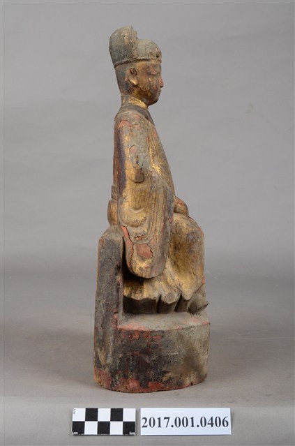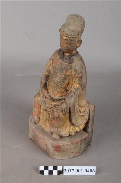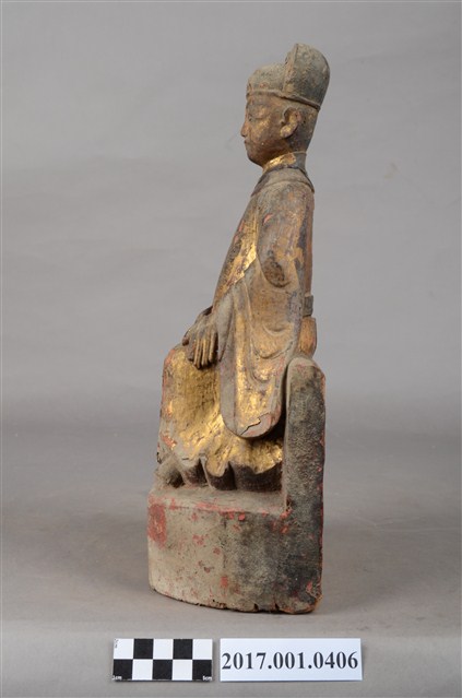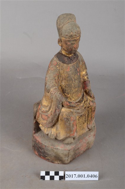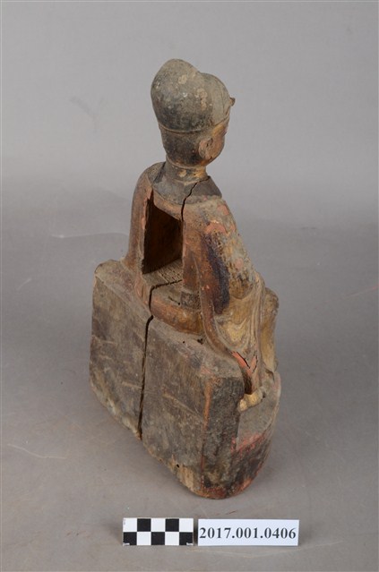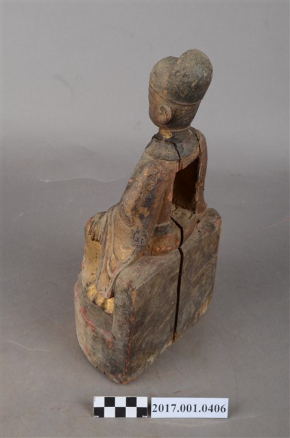 1.本件木雕文官侍從像,採坐姿姿態,表面施作塗裝、安金粧佛技法,局部漆面剝落,銘文字體不易辨識,背面開有長方形入神洞,封榫佚失,內容物件已取出,背面有縱向裂痕。頭部五官已模糊不清。頭戴幞頭,身著寬袖盤領衣,腰束腰帶,腳穿皂靴。挺身端坐,雙足垂下,左手放掌置於左膝,右手握腰帶。