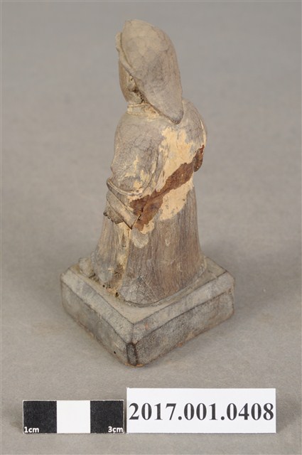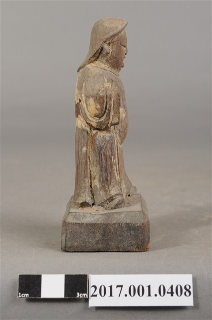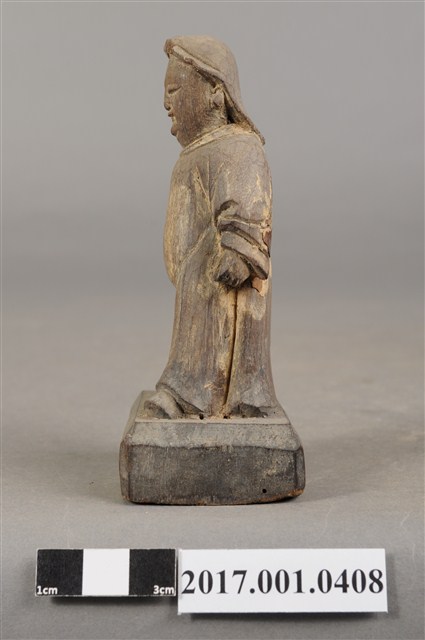 1.本件木雕文官侍從像,作立姿姿態,外表之粧佛已除去,背面尚存一塊安金層。頭形輪廓橢圓,雙目半睁。頭戴巾,身著窄袖長衫,肚腹圓凸,腳穿履。立像挺身以雙腳分立的姿態站於臺座上,左手向下,右手削除。臺座為方臺,四邊削斜,狀如梯形。