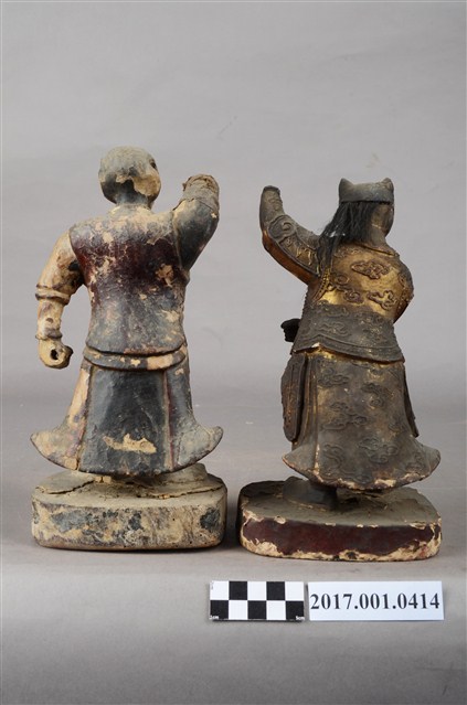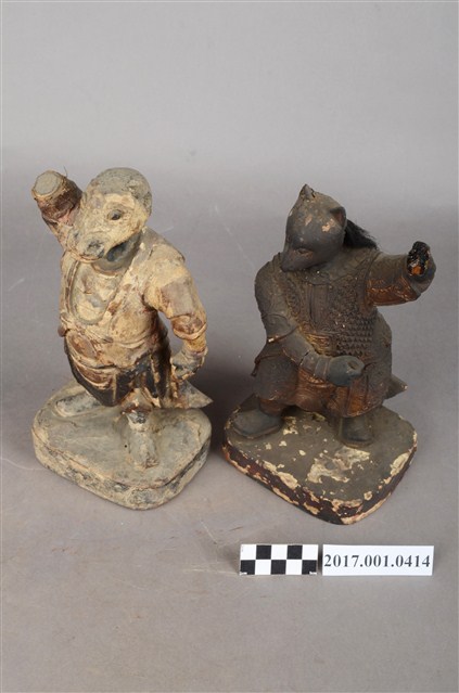 1.本件木雕牛頭、馬面將軍像為兩件一組,採立姿姿態,表面粧佛剝落嚴重。兩將軍皆作獸首人身,立像挺身以雙足分立的姿態站立,一手高舉、一手向下。從臺座底部判斷該件神像屬於近代作品。